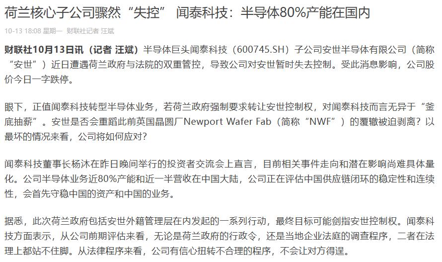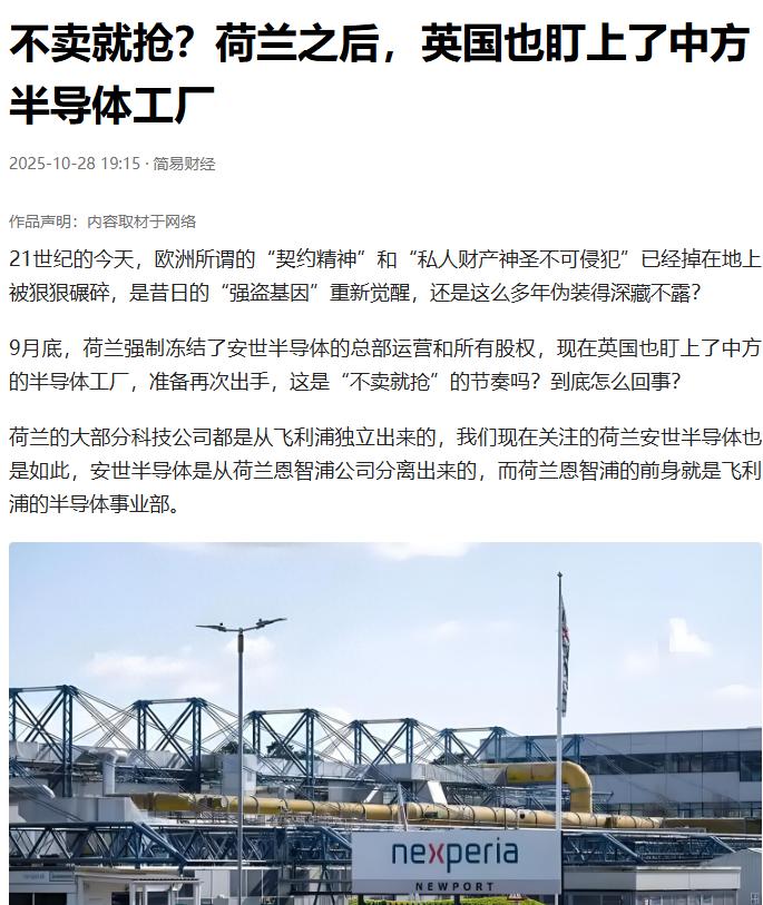 外媒:英国多位政界人士呼吁政府出于国家安全考虑,强制荷兰芯片公司安世半导体(Nexperia)出售其位于英格兰斯托克波特的芯片工厂。该厂年营收约1.92亿英镑,是英国最大芯片制造基地之一。 得清楚安世半导体的底细,它看着是荷兰公司,其实早就是中国的资产了。这公司最早是荷兰飞利浦的半导体部门,后来划给了恩智浦,2017年因为经营不好被挂牌出售,中国的智路资本和建广资产先花27.5亿美元买了下来,两年后又被闻泰科技接手。 闻泰为了拿下它可是下了血本,前前后后投了330多亿人民币,把安世100%的股权都买到了手,后来只是因为荷兰出了新规定,才象征性地留了1%股份给当地公司,实际控制权全在中方手里。 接手之后,闻泰砸了大价钱搞研发,安世很快就从当年的亏损部门变成了全球半导体行业的硬角色。 现在它是全球最大的车规级二极管和晶体管供应商,小信号二极管出货量全球第一,逻辑芯片市场份额全球第二,2024年光半导体业务就给闻泰贡献了147.15亿元营收和22.97亿元净利润。 斯托克波特工厂作为英国少有的规模化芯片制造基地,每年1.92亿英镑的营收背后,是给博世、西门子这些国际巨头供货的硬实力,英国本土汽车产业的电子控制系统,十有八九都用着这儿产的芯片。可英国政界突然跳出来喊“国家安全”,这说法简直站不住脚。 要知道英国半导体行业看着热闹,200多家公司加起来产值才近100亿英镑,而且72%的业务都集中在研发设计,制造环节本就薄弱,斯托克波特工厂这种能稳定量产的基地,早就成了英国制造业的“稀缺品”。 他们真正慌的不是安全,是自己搞不定核心制造,又怕中资把技术和产能做起来。 而且这已经不是英国第一次玩这套了,2022年安世刚收购英国NWF晶圆厂,英国政府就以同样的借口逼着闻泰把股权卖给了美国公司,当时闻泰本来计划用荷兰EUV光刻机升级生产线,硬生生被搅黄了。 这背后明摆着是美国在操盘。2024年底美国就把闻泰列入“实体清单”,2025年又搞出“穿透规则”,连子公司都要卡脖子,不准采购美国技术设备。 荷兰那边已经先一步动手,冻结安世资产还逼走中方管理层,英国不过是跟着美国的指挥棒凑热闹。 可他们没算明白,安世的供应链早就是全球一盘棋了,斯托克波特工厂的芯片要送到中国做封装测试,再供应给德国大众、宝马这些车企,欧洲汽车制造商协会早就放话了,要是供应中断超过一个月,欧洲车企生产线就得全面停摆,而现在车企的库存顶多撑几周。 英国自己的产业链更是经不起折腾。这些年他们对中资的偏见已经到了可笑的地步,长和集团旗下的ThreeUK要和沃达丰合并,就因为有中资背景,明明覆盖99%人口、承载29%移动数据流量的企业,硬是被拿国家安全说事儿。 可真把安世逼走了,最先倒霉的是英国本土工人,更别说汽车厂断供后连锁反应带来的失业潮。 他们嘴上喊着“保护本土产业”,实际上是把自己的制造业命脉往别人手里递——上次把NWF卖给美国公司后,工厂产能反而降了三成,这次再折腾斯托克波特工厂,恐怕又是重蹈覆辙。 说到底,英国政界喊着强制出售,根本不是真有什么安全风险,就是自己芯片制造能力跟不上,又甘心当美国的马前卒,带着偏见对中资企业下手。 安世的芯片早就像血液一样融进了全球工业体系,不是说剥离就能剥离的。真要把中方逼急了,闻泰手里还有近80%的国内产能能顶上来,可英国和欧洲车企找谁补窟窿? 那些喊得最凶的政客,恐怕没算过车企停产一天要损失多少亿,更没想过这种出尔反尔的做法,以后还有哪家外资敢来英国投资。 这种把经贸问题政治化的套路,本质上是破坏全球产业链的信任根基。 现在中国已经在加速自主创新,中芯国际14纳米工艺良率都到95%了,国产EDA软件也有了突破,英国越是打压,中国产业链自主可控的步子反而迈得越快。 最后只会发现自己亲手斩断了和全球顶尖制造能力的联系,把送到家门口的技术和就业机会推走,沦为大国博弈里的笑话。 全球产业链从来不是靠政治偏见维系的,而是靠实实在在的技术、产能和契约精神,逆规律而行的人,迟早要被市场狠狠教训。