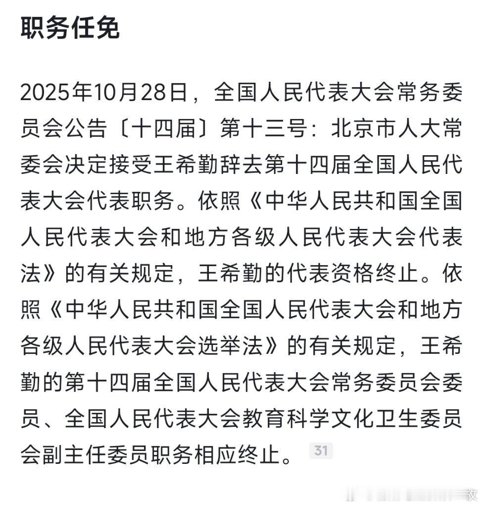 清华大学原校长王希勤辞去全国人大代表,代表资格终止,全国人大教科文卫委副主任委员职务相应终止。热点现场