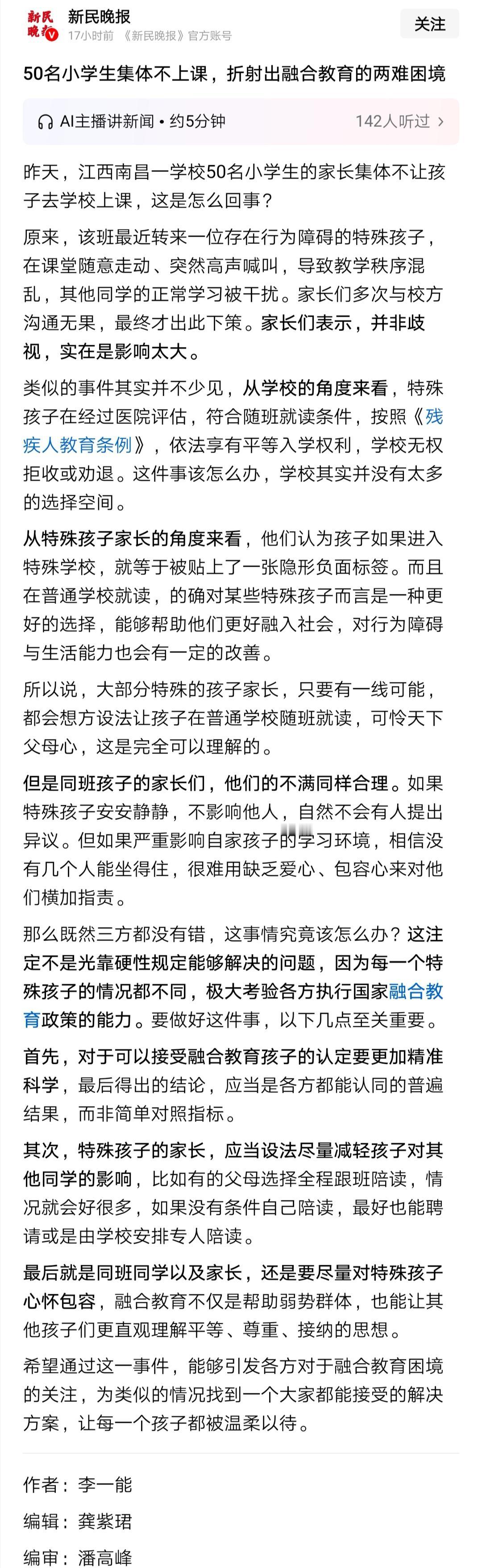 推进特殊儿童随班就读,必须有相应的师资与办学条件保障。学校接受了特殊儿童(如自闭症孩子),却没有特殊教育师资,就会把特殊随班就读变为家长间的冲突,其他家长要求特殊孩子转学,而特殊儿童也无合适去处。这类事已经不止一次发生,需要就特殊儿童的随班就读立法。