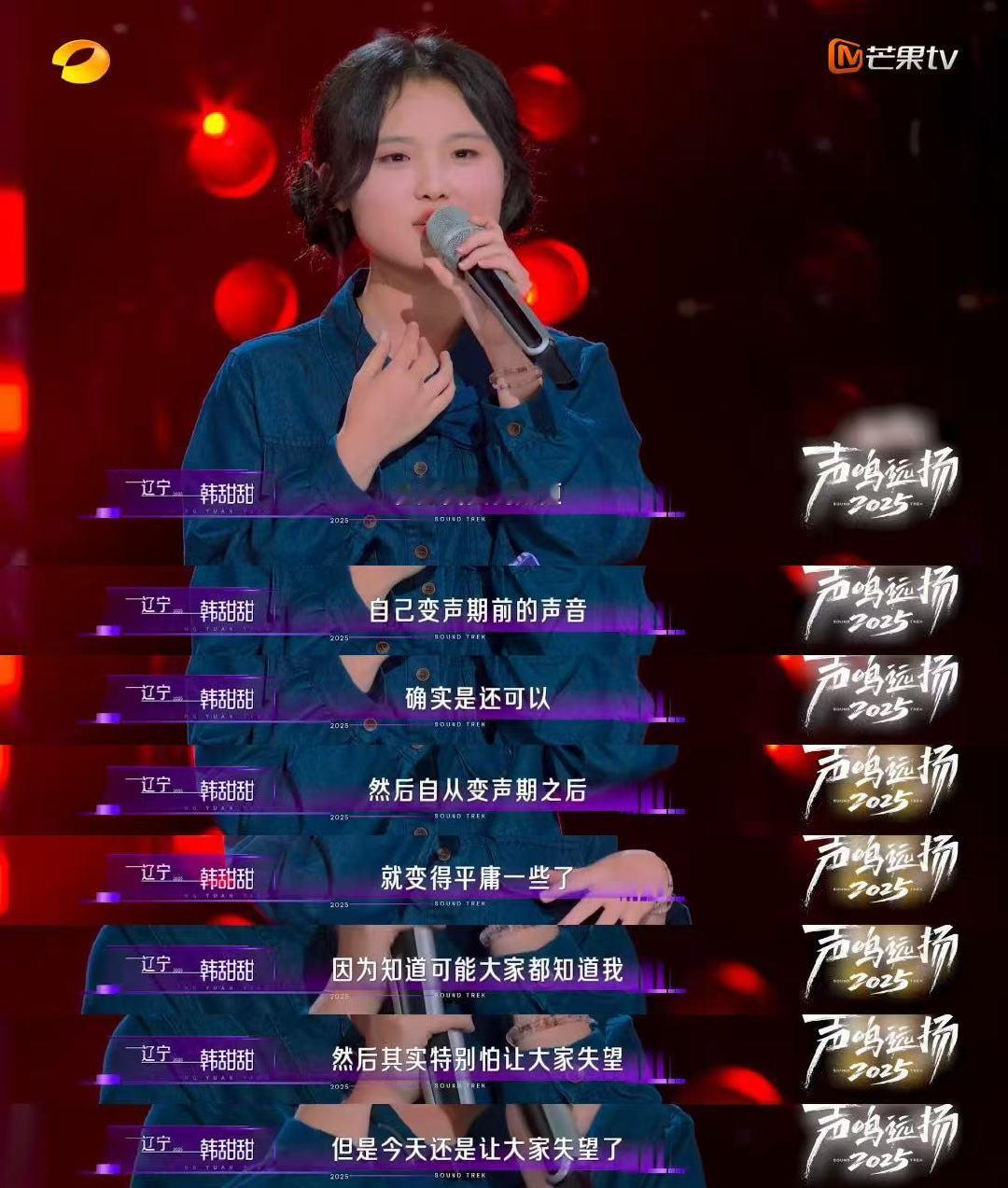 和刘宇宁合唱的童星惨遭淘汰 曾用《飞云之下》打动无数人的韩甜甜,登上《声鸣远扬》唱响《天下无双》,却因变声期未能驾驭高音出现破音,最终遗憾淘汰。她现场直言声音没了往日优势,评委暖心鼓励其明年再战,成长路上总有新可能!声鸣远扬
