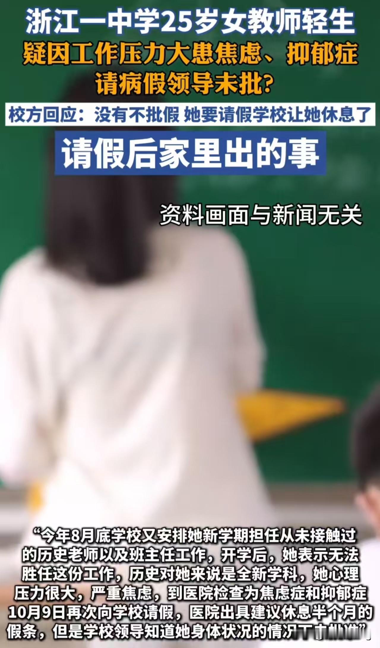 做过中学教师的都知道,想请个假是有多么的难。因为如果你请假了,今天原来有你的课,就要安排别的老师来替你上,这就要领导来进行沟通。如果对方没课的话还好,如果正好也有课,那就不好办了。即使有的给批假了,也要被冷嘲热讽一顿。 请一两天假都很难,更别说一下子请半个月了,金华市武义县武阳中学25岁的徐老师就是要请假半个月,要知道中学的课程都是很紧的,如果你请半个月假的话,那么这半个月就要有其他老师补班,对学生和其他老师的影响都是很大的。 徐老师的姐姐回应说,妹妹从今年8月底新学期开学之后,学校让她去任教她从来没有教过的历史学科,还让她做班主任,妹妹之前从来没有当过班主任,感觉到压力很大,后来逐渐患上了焦虑和抑郁症。在今年10月9日的时候,妹妹第二次向学校提出请假,因为医生说需要休息半个月,但是这次领导仍未批准请假。在10月11日的时候,妹妹选择了永远地离开这个世界。 但是学校方面的回应却和徐老师家人说的截然相反,学校工作人员说到:“没有不批假的事,生病了哪有不给假的”,并十分强调的说到:“这位老师是在请假后在家中出事的”,这句话的意思是不是在说,人是在家里想不开,出的事,不能怪到学校头上来啊。 家人说没有给批假,学校工作人员说肯定给批假了,双方矛盾的说法一时间让大家难以分辨到底该相信谁了?