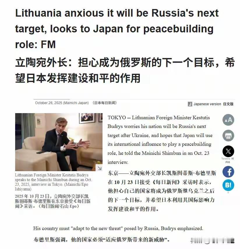 立陶宛又搞笑了!据日本《每日新闻》报道,近日立陶宛外长布德里斯访问日本时表示,希望日本能够发挥“建设和平作用”,与立陶宛“强强联手”,携手共同抵御某个拥有核武器的、侵略成性的、不遵守基于规则的国际秩序的,同时还“十分邪恶”的东方大国。真是不自量力,要说日本强还说的过去,立陶宛这个莞尔小国竟然还和日本比拟,有点过分了!这次指的这个东方大国不是中国,而是俄罗斯,现在立陶宛面对俄罗斯,怕得要死,恨不得举全国之力支持乌克兰和俄罗斯硬刚,可是乌克兰不给力,只能寻求域外国家,日本和俄罗斯因为北方四岛,闹得很僵,找上日本就是为了合力对付俄罗斯,可是现在日本对俄罗斯也不敢造次,实力不允许啊!况且日本也看不上立陶宛这种小国,俄罗斯如果想干立陶宛,估计用不了一天就拿下,就是这样的一个国家,还强强联手,这不是拿日本开涮吗?