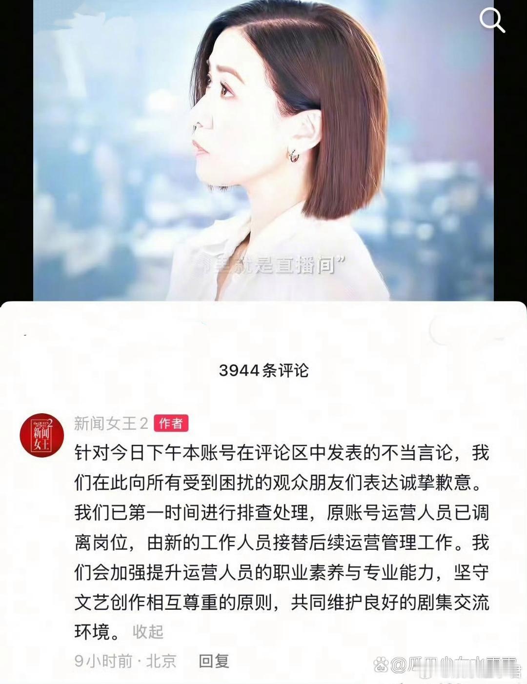 新闻女王道歉《新闻女王》官抖道歉起因是账号运营评论了《许我耀眼》相关目前该运营已被调离岗位。