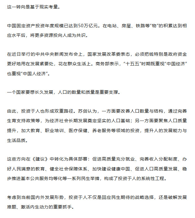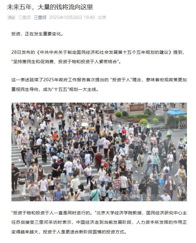【#未来五年大量的钱将流向这里#】投资,正在发生重要变化。28日发布的《中共中央关于制定国民经济和社会发展第十五个五年规划的建议》提到,“坚持惠民生和促消费、投资于物和投资于人紧密结合”。这一表述延续了2025年政府工作报告首次提出的 “投资于人”理念,意味着宏观政策更加重视民生导向,成为“十五五”规划一大主线。()