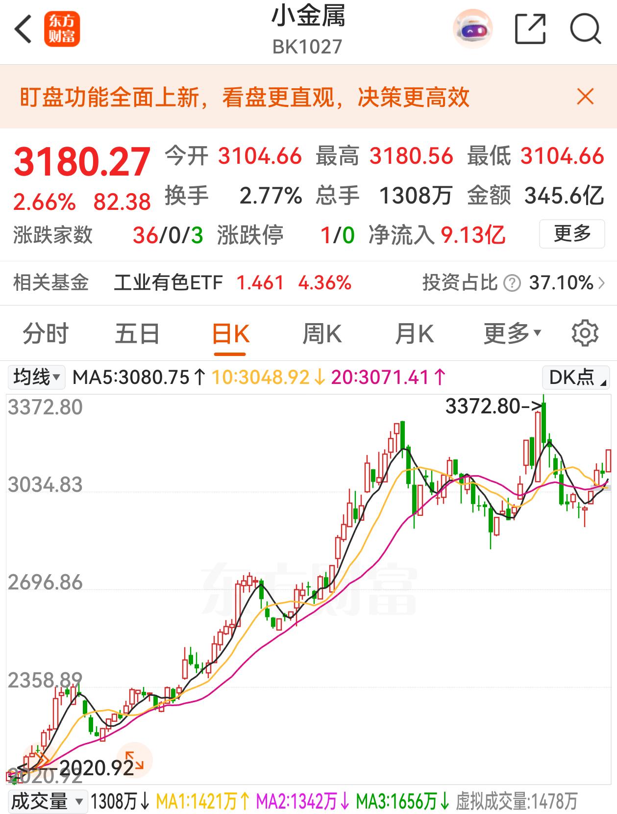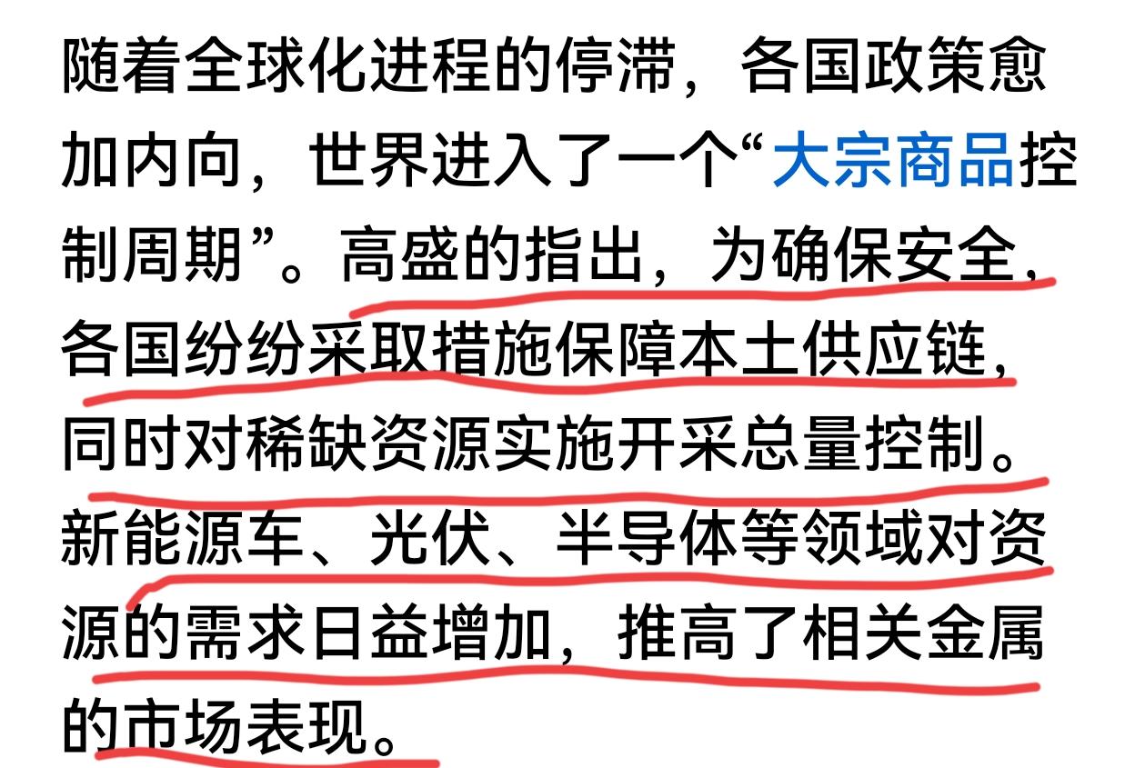 高盛报告认为世界进入一个“大宗商品控制周期”,推高相关金属的市场表现。大宗商品价格的上涨利好金属股,催生了A股金属板块的行情。 今天能源金属、小金属、有色金属成了市场的领头羊,涨幅占据了A股板块涨幅榜前几位。金属股大涨是对大宗商品价格走势的反映,是有业绩支撑的。各种金属走出了持续上涨的态势,可以说相关金属涨声一片,除了稀土、小金属钨、钼、锡、锑,能源金属钴等价格上涨外,铜、铝、锌、铝等的价格也走在上升通道之中,大宗商品行情催生股价行情,相关个股上涨也就是自然的事了。 高盛报告认为,为确保安全,各国纷纷采取措施保证本土供应链,同时对稀缺资源实施开采总量控制。刚果对钴出口采取精细灵活的配额制,钴价从年初的17万元/吨涨到41万元/吨 ,印尼调整生产配额措施,镍出口禁令在推动产业价值留存方面成效显著。但需求端需求在增加,新能源汽车、光伏、半导体等领域产业扩张,推高了相关金属的市场表现。 能源金属、小金属、有色金属,新能源汽车、光伏、半导体、核聚变、量子科技等新兴和未来产业都离不开,再好的技术,离开这些资源就是无米之炊。“大宗商品控制周期”开启,金属价格走在上升通道之中,A股相关金属板块表现尚在进行时。