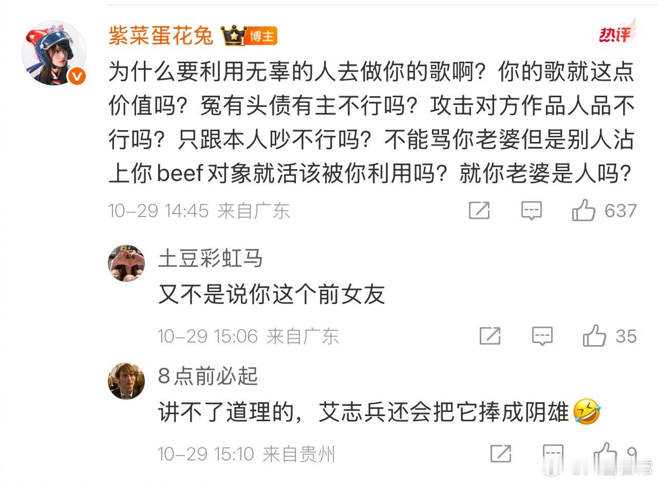 Asen用杨和苏、法老前女友的视角写diss,对此法老前女友紫菜蛋花兔发微博质问Asen:为什么要再一次伤害我?