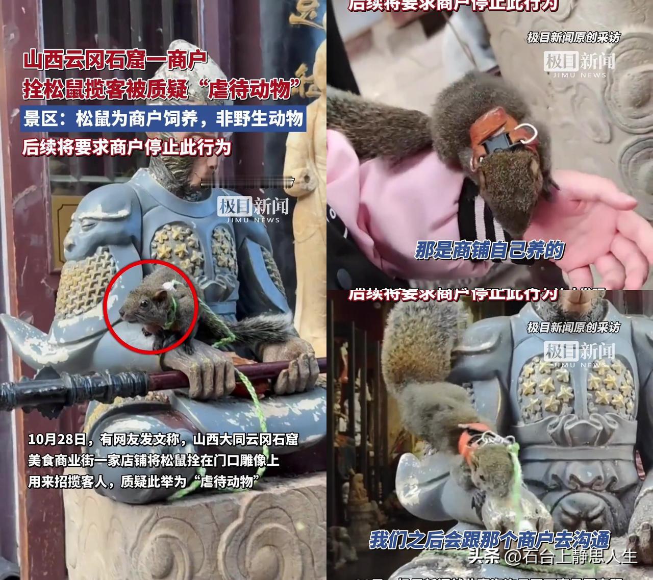 拴个自己养的松鼠揽客,也能被骂虐待动物? 10月28号,有人逛云冈石窟美食街,看见一家店门口拴着松鼠,本以为是玩具,走近才发现是活的,松鼠被拴在雕像上一直喘气,这人立刻发帖指责虐待,还说早知道有这东西根本不会来。 景区回应了:松鼠是商户自己养的,不是野生动物,之后会让商户停止。 有人说,就算是饲养的,拴着限制自由也可怜;也有人说,花鸟市场全是拴着的鸟和鱼,怎么不去说花鸟市场?更有人反驳,自己吃烧烤的时候怎么不心疼肉里的动物?唐僧都没这么圣母。 但我觉得,商户拴松鼠揽客确实不对,可动不动就扣虐待的帽子也太双标了吧?难道自己吃着烤串,还管别人拴不拴松鼠?这爱心也太假了! 大家怎么看?