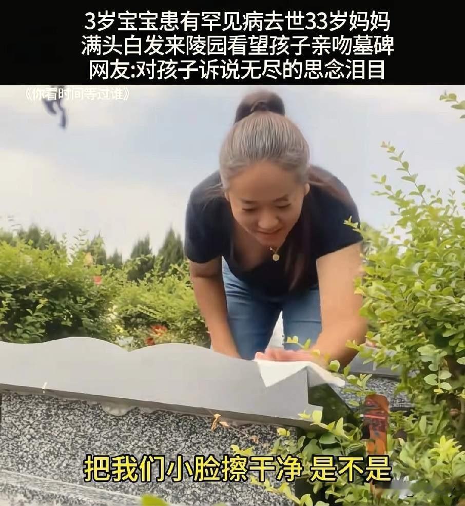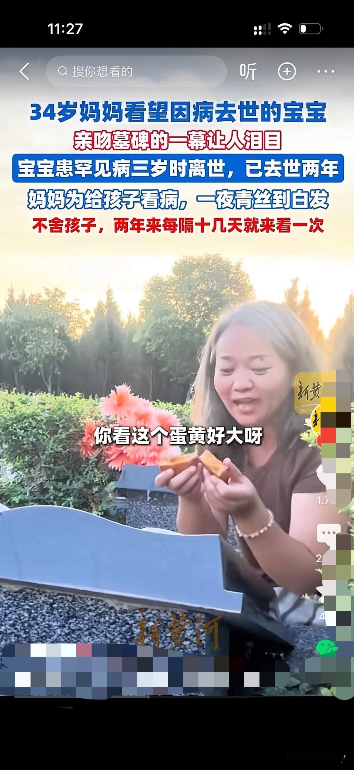 河南一位34岁的妈妈两年前她三岁多的宝贝,因为得了罕见的病无法医治离世了! 在给孩子看病期间妈妈急的一夜白了头,孩子离开后妈妈的心也随着去了,一直不能从失去宝宝的阴影里走出来! 时间已经过去了两年,这位妈妈每隔十几天就会来到孩子的墓地,给孩子买他喜欢吃的零食,换季了给孩子买衣服!还时不时的低下头去亲吻墓碑! 强忍悲痛跟孩子说着话,聊着家里发生的事儿,轻轻地喊着宝宝的名字,却听不到宝宝咿咿呀呀的回应!这一幕太让人心疼了! 希望位妈妈为了自己,为了家里人还是要学会放下,过程一定很痛苦,但还是应该走出来!就让孩子活在你的心里吧!