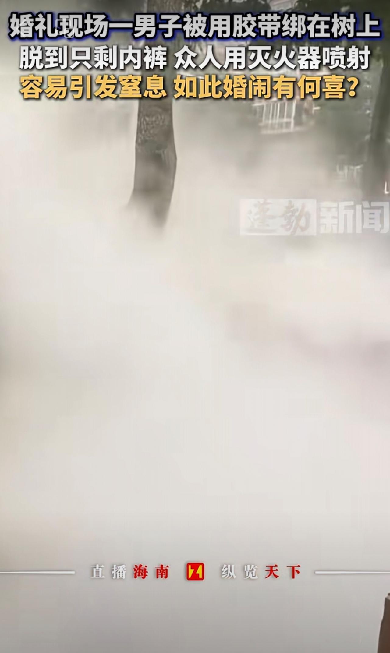 婚礼现场一男子被用胶带绑在树上,脱到只剩内裤众人用灭火器喷射,容易引发窒息如