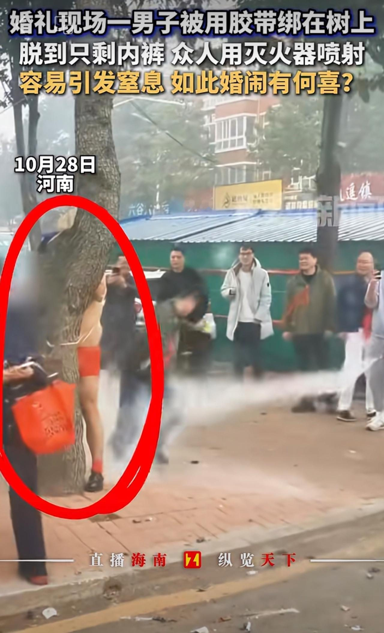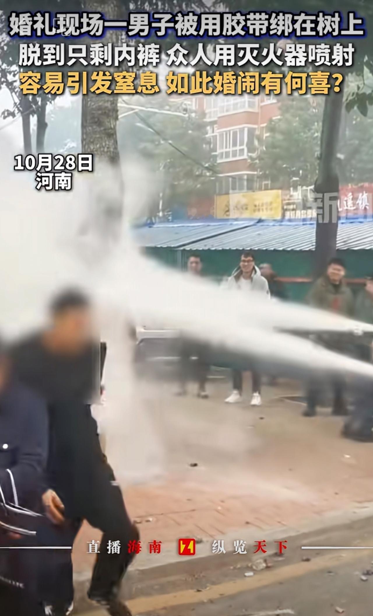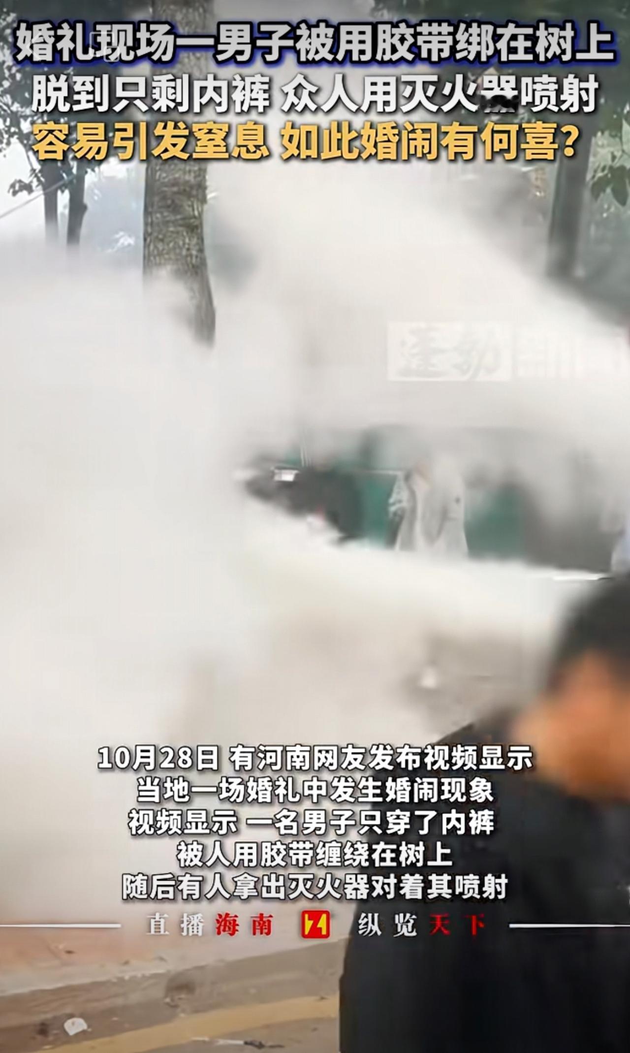 婚礼现场一男子被用胶带绑在树上,脱到只剩内裤 众人用灭火器喷射,容易引发窒息 如此婚闹有何喜?婚闹 河南 安全