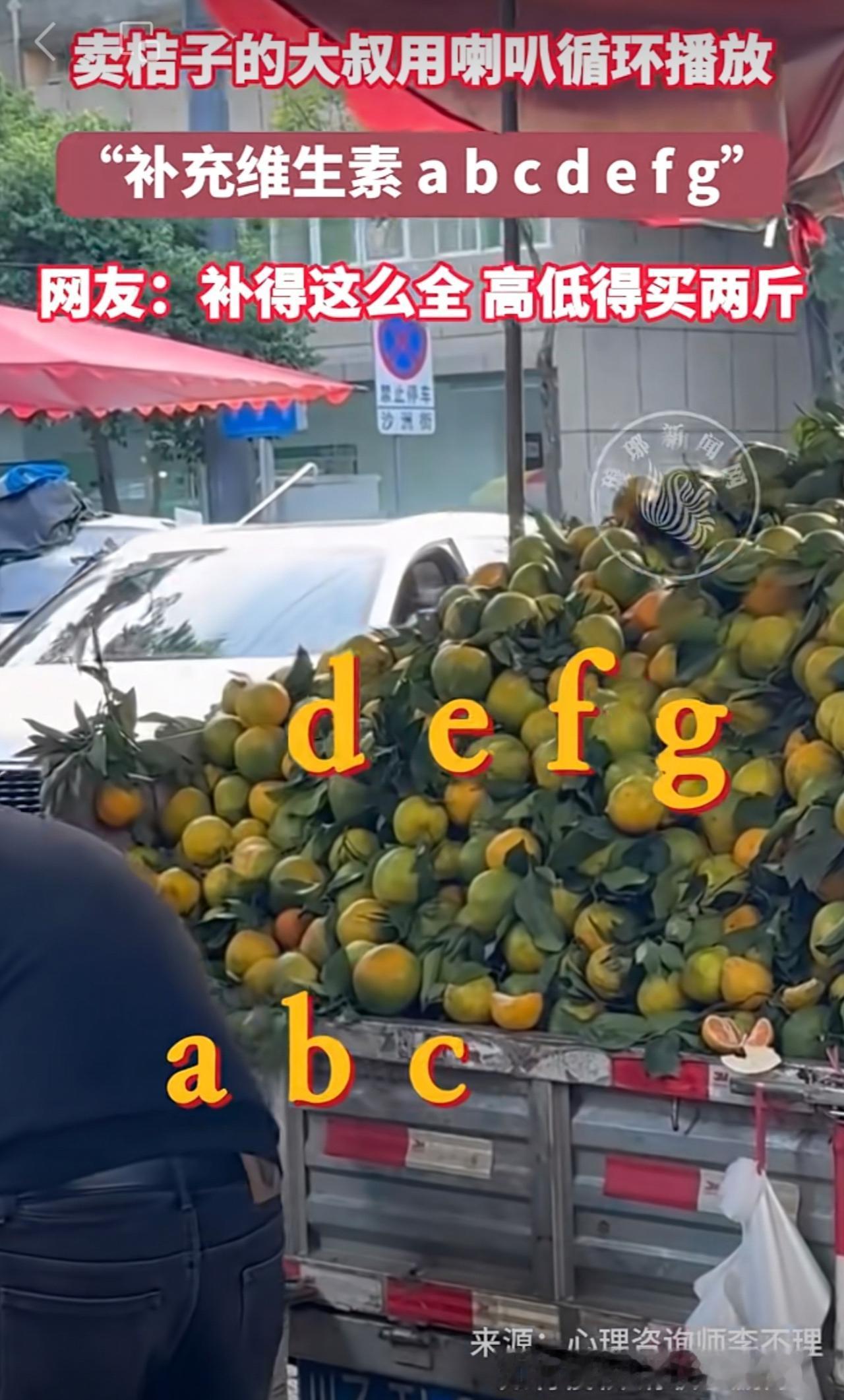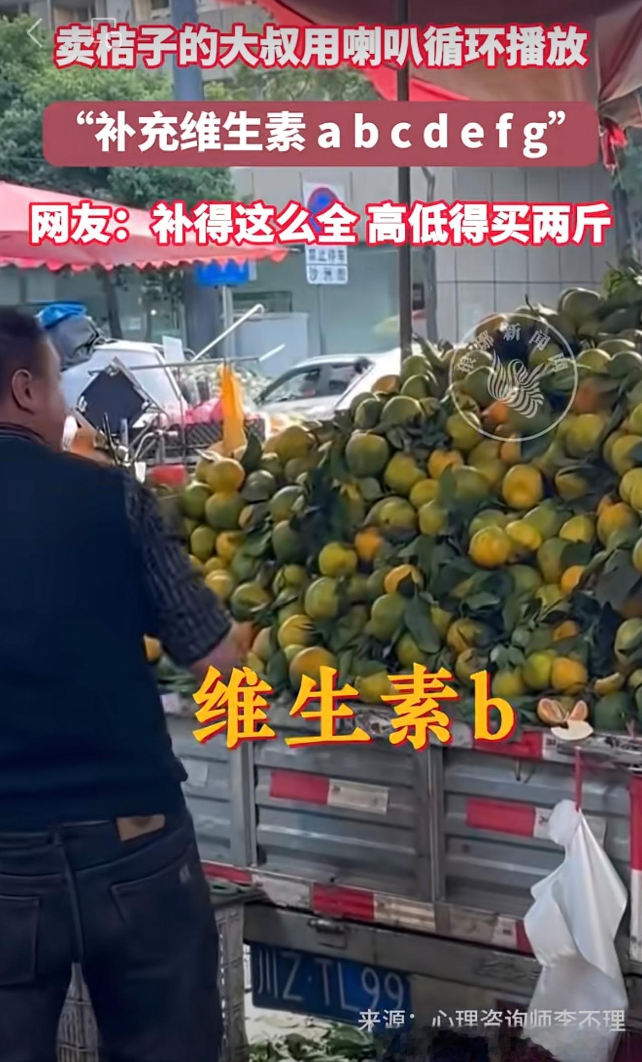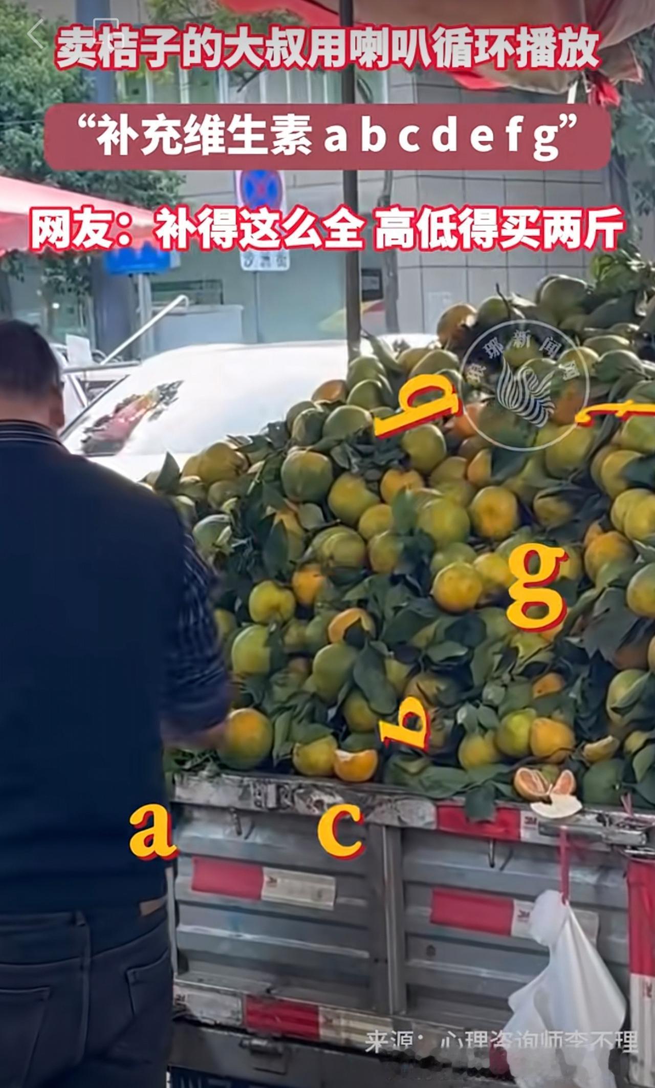 10月27日,四川。卖桔子的大叔用喇叭循环播放,“补充维生素 a b c d e f g”,网友:补得这么全 高低得买两斤。(z)