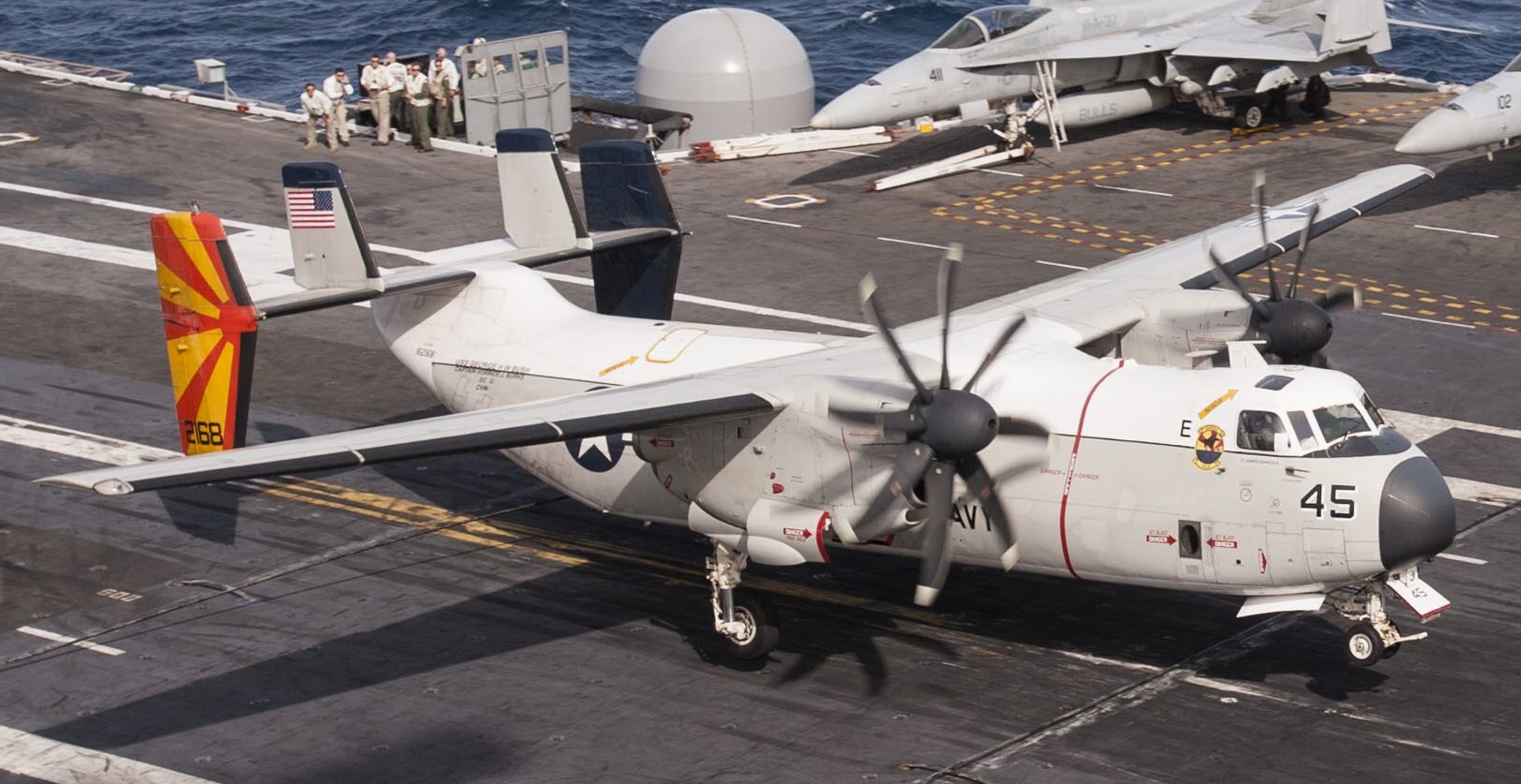 使用T56-A-425涡桨发动机的C-2系列运输机,一开始也是用4桨叶螺旋桨,后来才换成了E-2同款的8桨叶螺旋桨