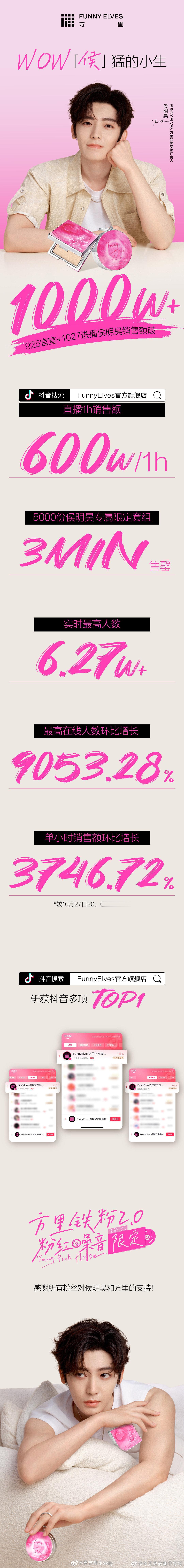 侯明昊直播战报:1小时破600万,总破销售额1000万+,商业价值直线上升,有效播剧[打call]