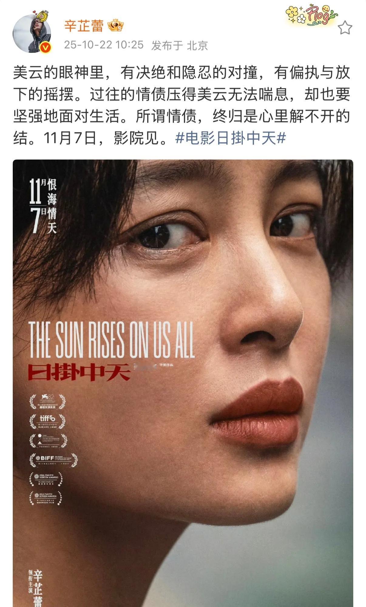 辛芷蕾发完你的发你的,姐姐好忙啊! 2025年10月末,辛芷蕾开启“工作连环炸”模式:11月撞刊《ELLE》《嘉人》《V中文版》三大顶刊,《嘉人》复古造型获赞时尚表现力突破;官宣两部一番剧,威尼斯获奖作《日掛中天》定档11月7日,新剧《金色》未播先火,还新增两个高端商务,事业粉好骄傲! 金色九月凭借《日掛中天》中曾美云一角的绝佳演技,辛芷蕾获得第82届威尼斯最佳女演员奖项。十月第18届亚太电影大奖最佳表演奖的提名又紧随而至,接连获得国际顶级电影节的青睐,这把全票通过的演技含.金.量不言而喻。 两个月内连续收获佳绩,戏路稳、表演准,在释出的片段里已尽显超强演技。实力从来不需悬.念,只需等待又一个高.光时刻,太期待电影11月7日正式上映了。 辛芷蕾的眼神里真的充满了野心与力量,威尼斯影后只是她的一个开始,相信蕾子会一直星途坦荡的!