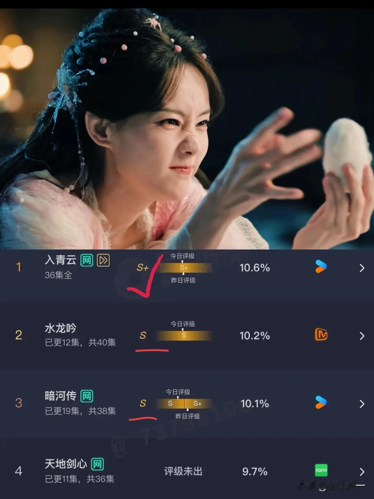 新剧播成这样[捂脸]成毅、龚俊、罗云熙在家哭晕了吧! 三部大男主剧全部降级跌到S,被早已完播的《入青云》压了大头。 李一桐体寒就算了,怎么和肖战《藏海传》要掰头的成毅《赴山海》不行之后,《天地剑心》也扑了啊。 罗云熙的《水龙吟》可是对标昔日云合集均破6000➕的《长月烬明》,离开白鹿,合作林允、包上恩、陈瑶也带不动了! 连一部上11的都没有,剧得难看成啥样了,还是期待丁禹兮、宋茜的《山河枕》算了! 罗云熙 龚俊 成毅 丁禹兮
