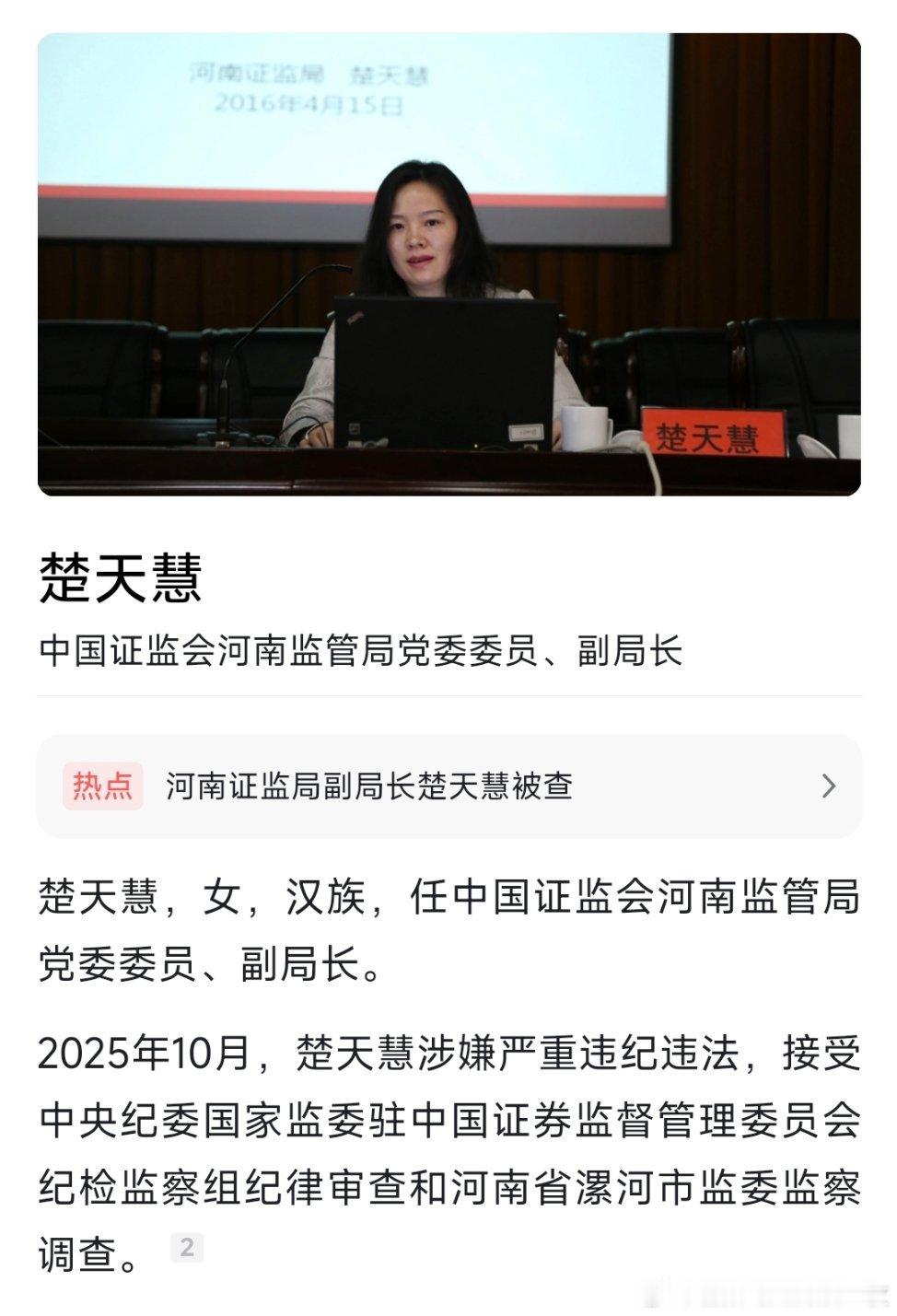 河南证监局党委委员、副局长楚天慧接受纪律审查和监察调查。热点现场