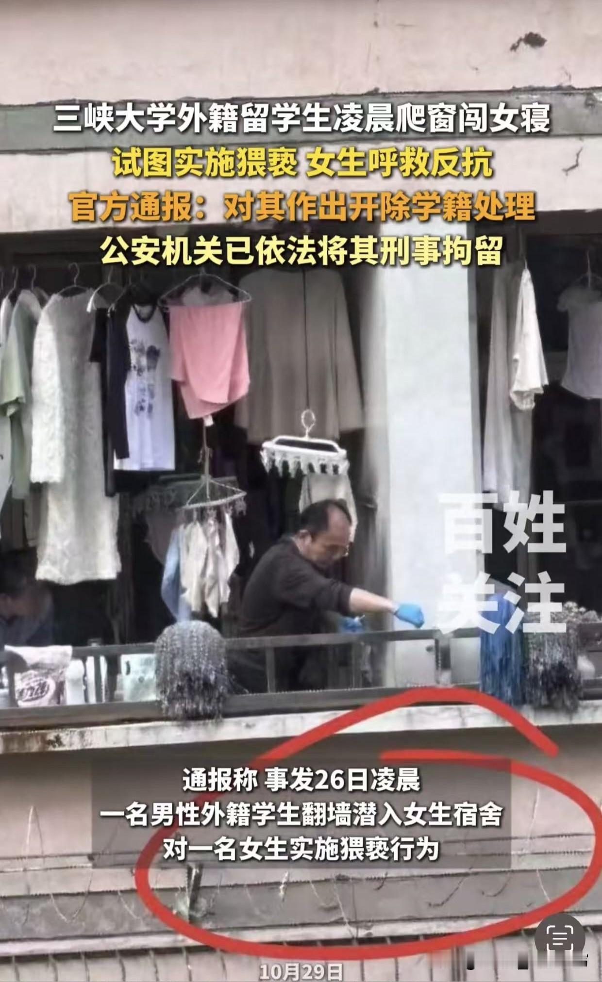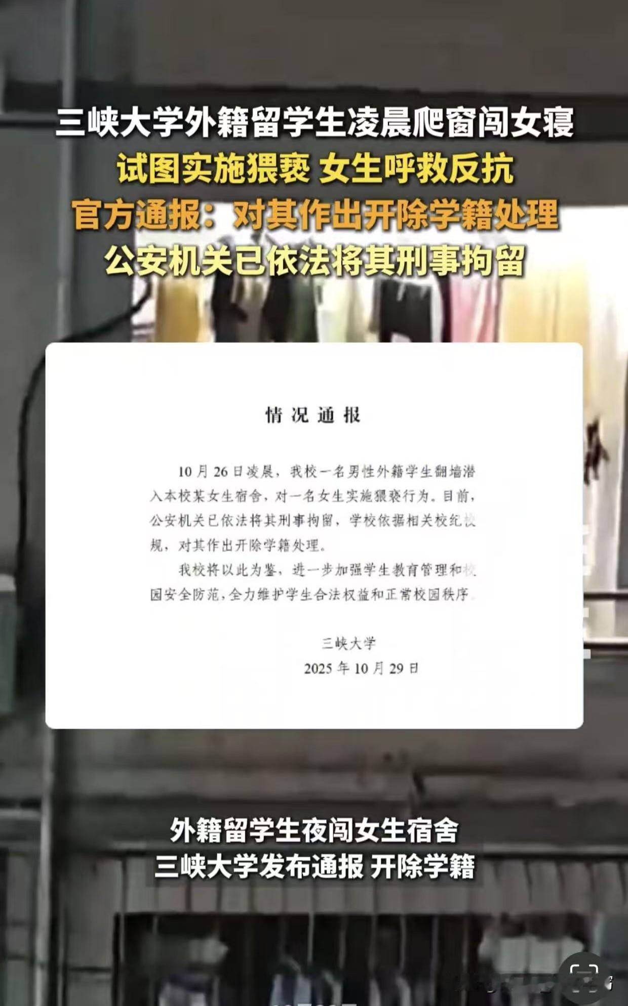 外籍留学生半夜爬二楼,闯进女生宿舍动手动脚! 这哪是留学生,简直是恶狼! 女孩拼命尖叫才逃过一劫,想想都后背发凉! 人抓了,也刑拘了,可学校一声不吭,早干嘛去了? 门禁是纸糊的?监控是摆设? 这些年,多少类似的事,最后都是“批评教育”“劝退了事”? 咱们的孩子就该担惊受怕吗? 欢迎留学没问题,但底线不能丢! 谁放进来的人,谁给带走!别祸害老百姓! 这事不能糊弄过去!坚决严惩。 对此你怎么看?