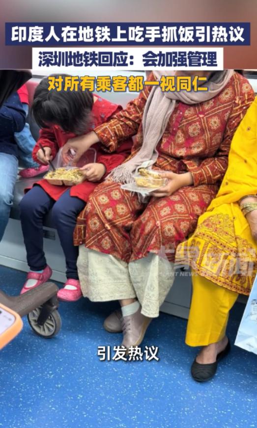 [浮云]滚回自己的国家!10月25日,广东深圳,几名印度人坐地铁时,竟然在大庭广众之下吃手抓饭! 虽然有人上前劝阻过他们,可印度人根本不听,地铁站回应:对所有乘客都一视同仁,不会因为是外国人不管。 10 月 25 号的深圳地铁,一趟行驶中的列车里突然冒出了股饭菜香味。这香味没让人觉得舒服,反倒让不少乘客皱起了眉 —— 几名印度乘客中,有两人从随身包里拿出了手抓饭,就在满车厢人的注视下直接吃了起来。 安全员完成例行巡逻离去未久,这二人便肆无忌惮地开启进食,全然没了顾忌。旁边乘客看不过去,有人小声提醒地铁里不能吃东西,可这两位要么没听懂中文,要么就是故意无视,自顾自地继续用餐,完全没在意周围投来的诧异目光。 其实不管是中国还是外国,大部分城市的地铁都有禁食规定。为啥要这么规定?密闭空间里食物气味容易扩散,有人可能对某些味道敏感,甚至引发不适。 有人觉得不管哪国人,到了一个地方就得守当地的规矩,公共场合讲文明是基本素养,这跟国籍没啥关系。也有人猜测,会不会是这些印度乘客不了解中国地铁的禁食规则,没人事先跟他们说清楚。 还有人提到,之前上海、广州地铁也出现过类似情况,不管是中国人还是外国人,违反规定都会被劝阻,关键是要一视同仁,不能搞特殊对待。 地铁站后来的回应也挺明确,工作人员说当时安全员巡逻时对方还没开始吃,等发现的时候已经是网友发了视频之后。 后续会增加巡查的次数和密度,不管是中国乘客还是外国乘客,只要在地铁里吃东西,都会及时上前制止,绝对不会因为对方是外国人就睁一只眼闭一只眼。 说句实在的,公共空间的规则从来都不是针对某一个群体。你图自己方便,在车厢里吃东西,可能就影响到了身边人的感受。 不管来自哪个国家,有着什么样的饮食习惯,到了公共场合,就得遵守大家都认可的规则,这不是歧视,而是最基本的尊重 —— 尊重别人的感受,也尊重当地的公共秩序。 不能因为是外国人就放宽要求,也不能因为是本国人就格外严格。这次地铁站明确表示 “不搞特殊化”,这一点值得肯定。 但更重要的是,能不能在事前多做一些提醒?比如在地铁入口、车厢内增加多语言的禁食提示,让不了解规则的外国游客能提前知道,这样也能减少类似情况的发生。 希望这次的风波能给更多人提个醒,公共规则面前人人平等,遵守规则既是尊重他人,也是提升自己。未来不管是本地乘客还是外国友人,都能自觉守护公共空间的文明,让类似的不文明现象越来越少。