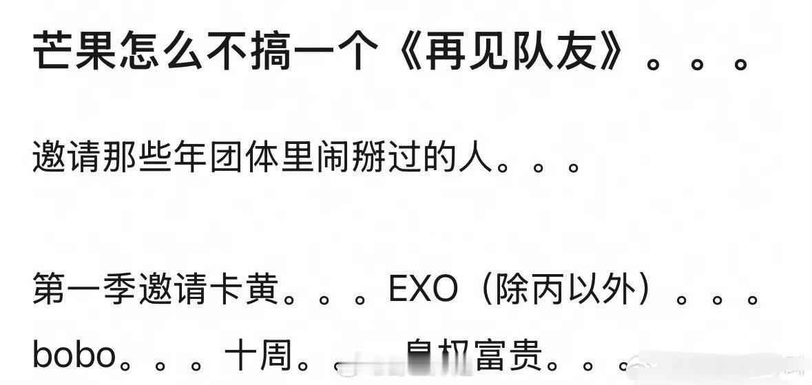 有网友提问说芒果台干嘛不也搞一个《再见队友》的综艺,毕竟《再见爱人》的热度可不低,直接弄个姊妹篇一样,邀请那些年团体里闹掰过的人,好像蛮有看点啊