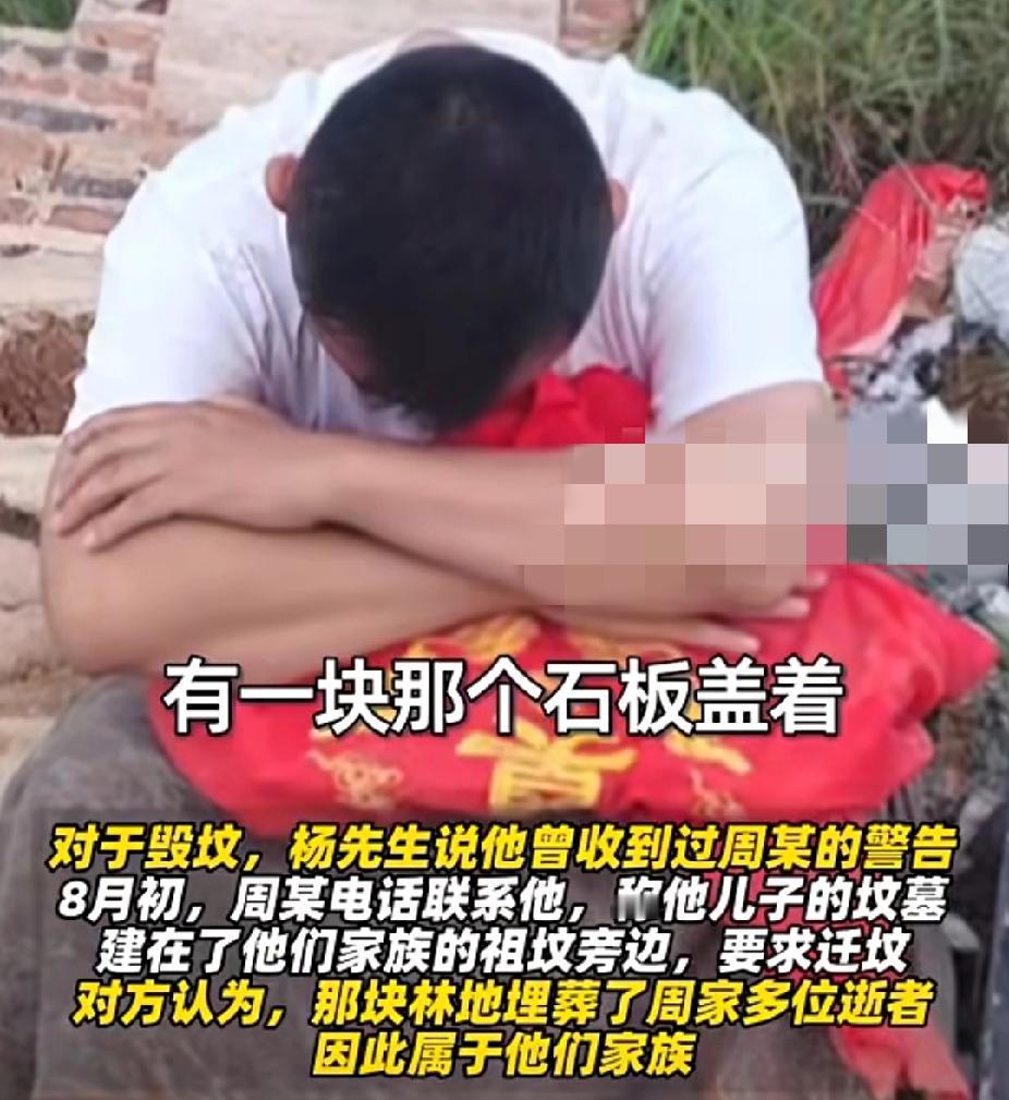 心痛!八岁男童下葬4个月后坟墓被同村人破坏,骨灰盒抛至野外!家人发现时坟墓里的草已经两厘米高! 云南大理杨先生的儿子小杨曾被诊断为小脑萎缩和癫痫,3岁时就被认定为一级残疾。今年4月份,小杨不慎摔倒引发脑出血,抢救无效后离世。 因为当地有“夭折的孩子不进祖坟”的观念,儿子病逝后,杨先生将其埋葬在山上一块国有林地里。坟墓的大小和位置都是根据镇政府的要求来的。 今年中元节,杨先生前来祭奠儿子,却发现儿子的坟墓被破坏。骨灰盒被扔在距离墓碑两米的野地里,墓坑里的草已经有两厘米高了。 杨先生气的发抖,同时也为没有保护好孩子而痛哭。 之后杨先生报了警,称自己曾收到同村人周某的威胁,对方称小杨埋到了周家祖坟边上,还以“毁坟”来威胁杨先生。 据悉,周某家有几位过世的长辈都埋在这一块林地,周某便认为这一块是自己家祖坟。 经警方调查和调解,周某向杨先生深刻地表达了歉意,并表示会赔偿杨先生。镇政府也会协商小杨的迁坟费用。 可怜的孩子,活着的时候就一身病痛还遭遇不幸。离世了还被毁坟,真的让人心痛。 不过对于“夭折的孩子不能进祖坟”这一观念,我不理解,只能表示尊重。对此,你怎么看呢?云南 砸坟事件
