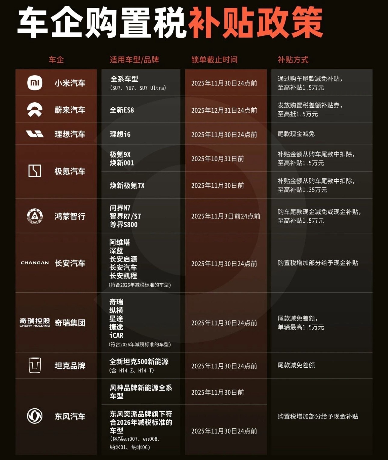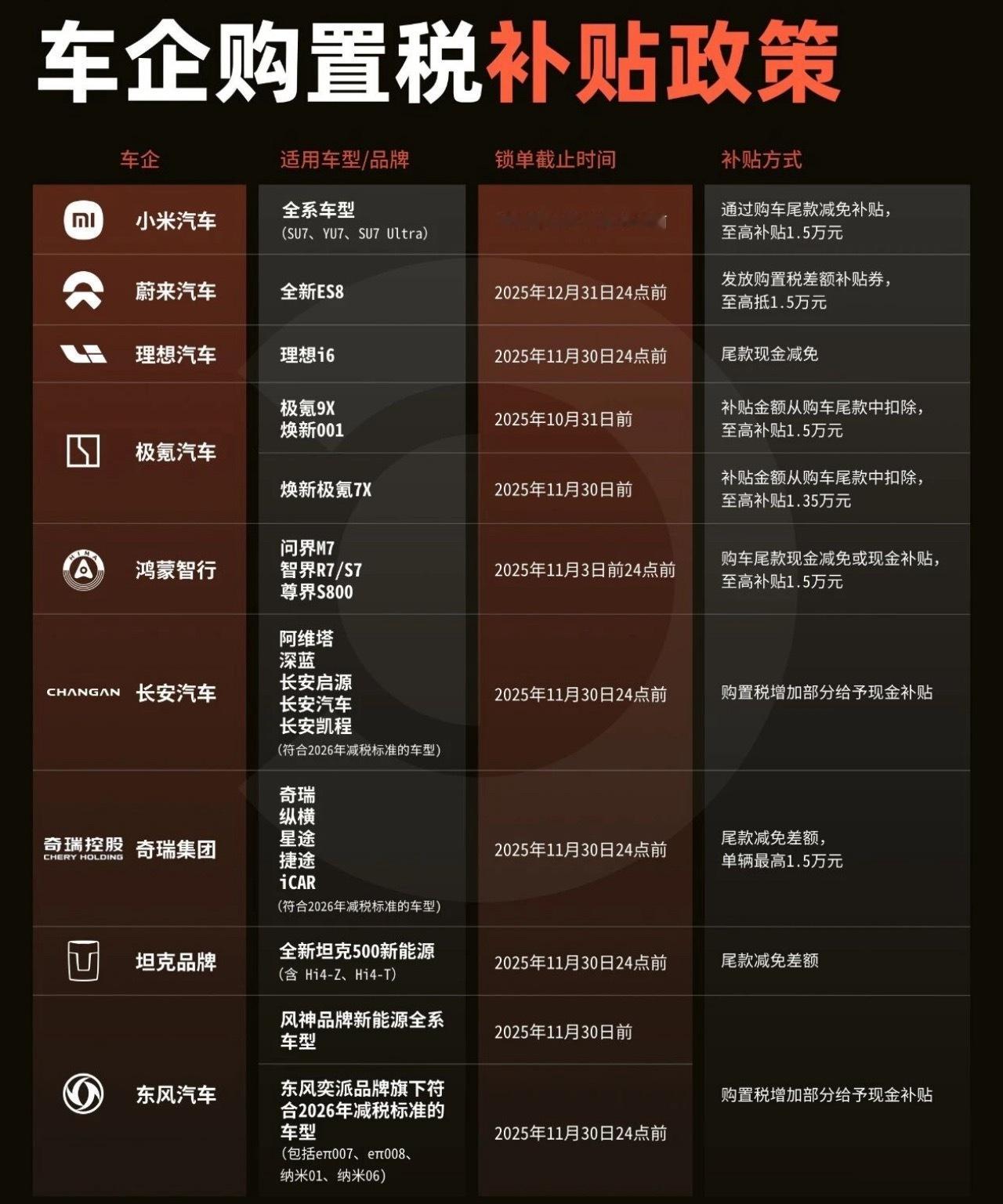 全网最全!各大车企购置税补贴最新政策2025 年,是新能源车享受全额免征购置税的最后一年。