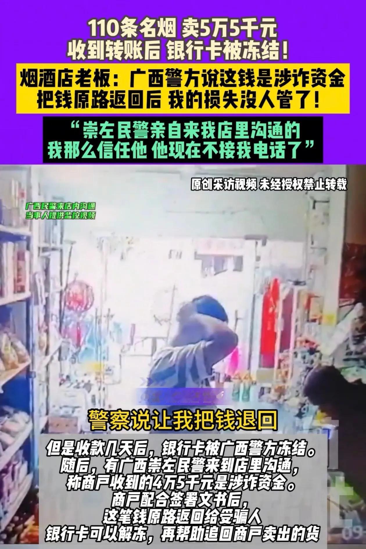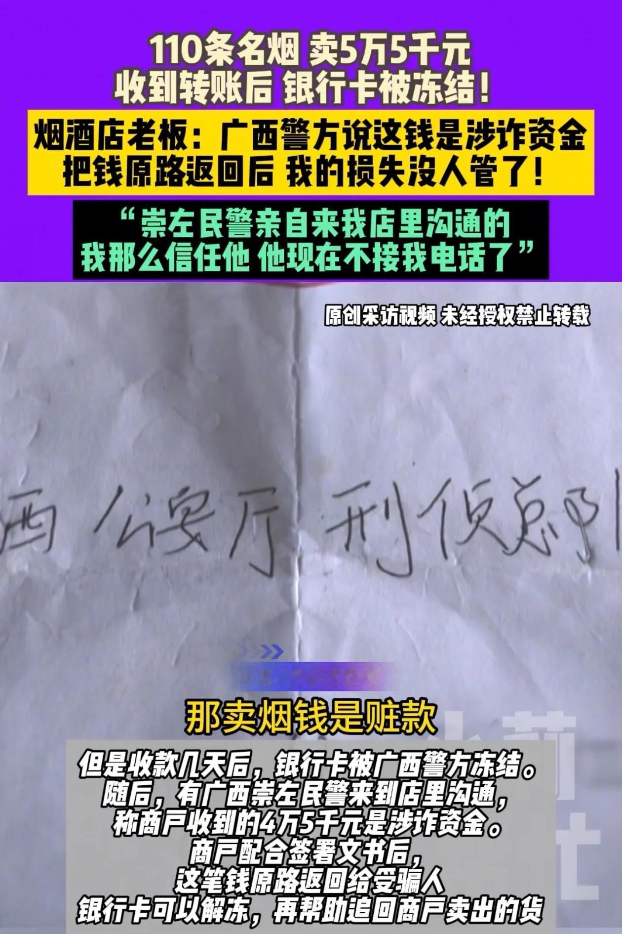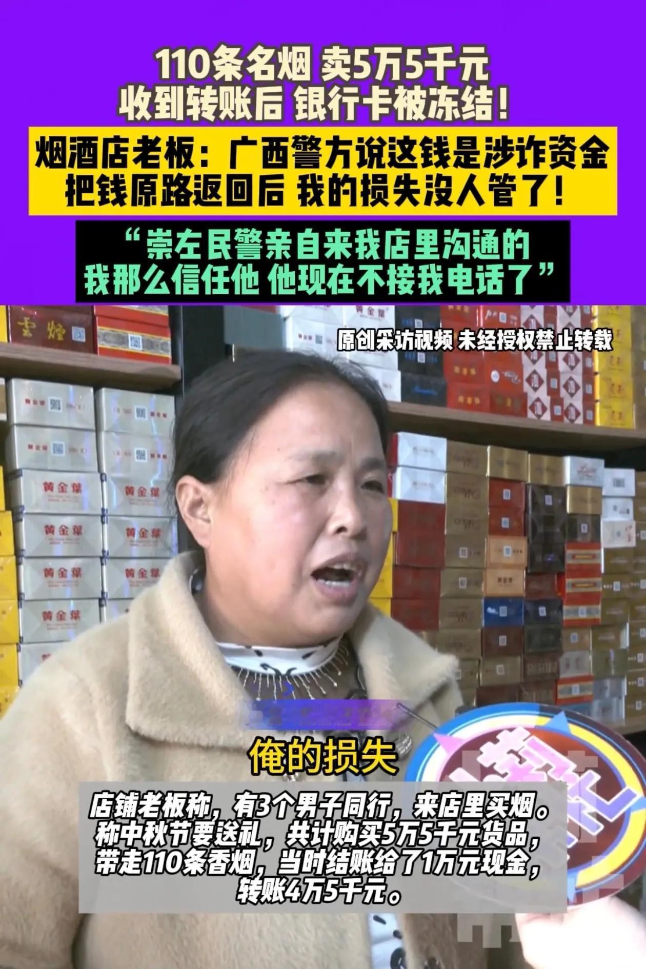 河南,3名男子去买烟,张口就要110条烟,总计5.5万元,万万没想到,这单"大生意"竟成了压垮小店的最后一根稻草。 中秋前夕,店里来了三个穿着体面的男人,说是单位采购要送礼,张嘴就是五万五的单子,店主两口子当场乐坏了。结账时对方递来一沓现金凑了一万,剩下四万五说转账方便。 谁料三天后,正准备去进货,手机突然弹出银行卡冻结通知,打电话一问才知道,广西警方说那四万五是诈骗赃款,要原路退回给受害者。 店主想着配合警察是应该的,二话没说就把钱转了过去,文书也签了字按了手印,结果左等右等就是没动静,微信不回电话不接,那一百一十条烟就像人间蒸发了一样,现在柜台空了一半,供货商天天打电话催账。 如今夫妻俩抱头痛哭,连进货的本钱都凑不出来了。 网友评论: 一手退货一手退钱,开个商店怎么能知道钱是不是干净钱。 购买数量大于正常消费标准。但是追款时必须把货物清还才可以! 赃不赃款跟店主有啥关系,他出钱我出烟,这是买卖关系。 我开店是做生意的怎知人家钱是黑钱,国家银行应付主要责任。 别人犯罪店主买单,欺负弱者保护强者。
