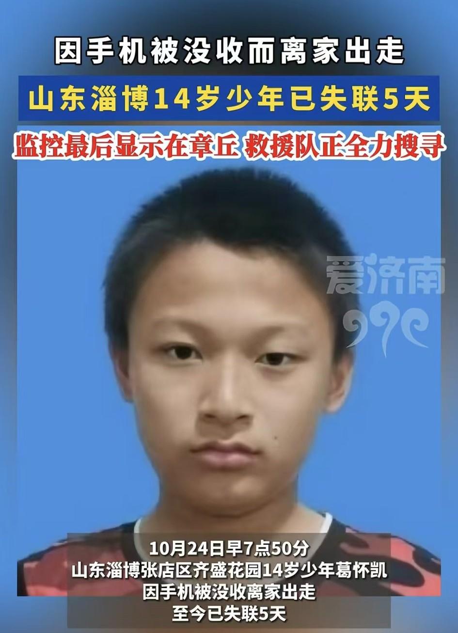 多帅的小伙子啊!就是脾气太大了,手机被没收就离家出走,救援队的叔叔们已经找了你好几天了,气也该消了,快快回家去吧! 14岁少年葛怀凯,在10月24日(上周五)早上7点50分离家,穿着红外套和校服裤却没有去上学,监控显示最后出现在双山某村鱼池附近。 淄博到章丘约60公里,开车也得1小时左右,他是从王村沿着102到章丘普集,又从普集去的双山。 他并不是一路步行,据称期间有乘电动三轮车,也有人说这孩子很机灵,应该不会被人骗走。 有目击者反映孩子饿得不行,进店要了点吃的,但看见有人打电话找救援队就跑了。 目前救援队按两条线找孩子,一条是章丘,另一条是济南市里。 感觉难办的就是这孩子疑似刻意躲着,饿了可以找好心人要点,夜里那么冷,不知会躲到哪里御寒。 也真够家长操心的。
