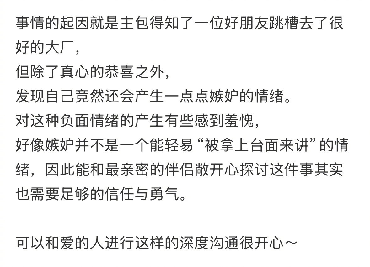 今天鼓起勇气和男朋友分享了自己的嫉妒情绪