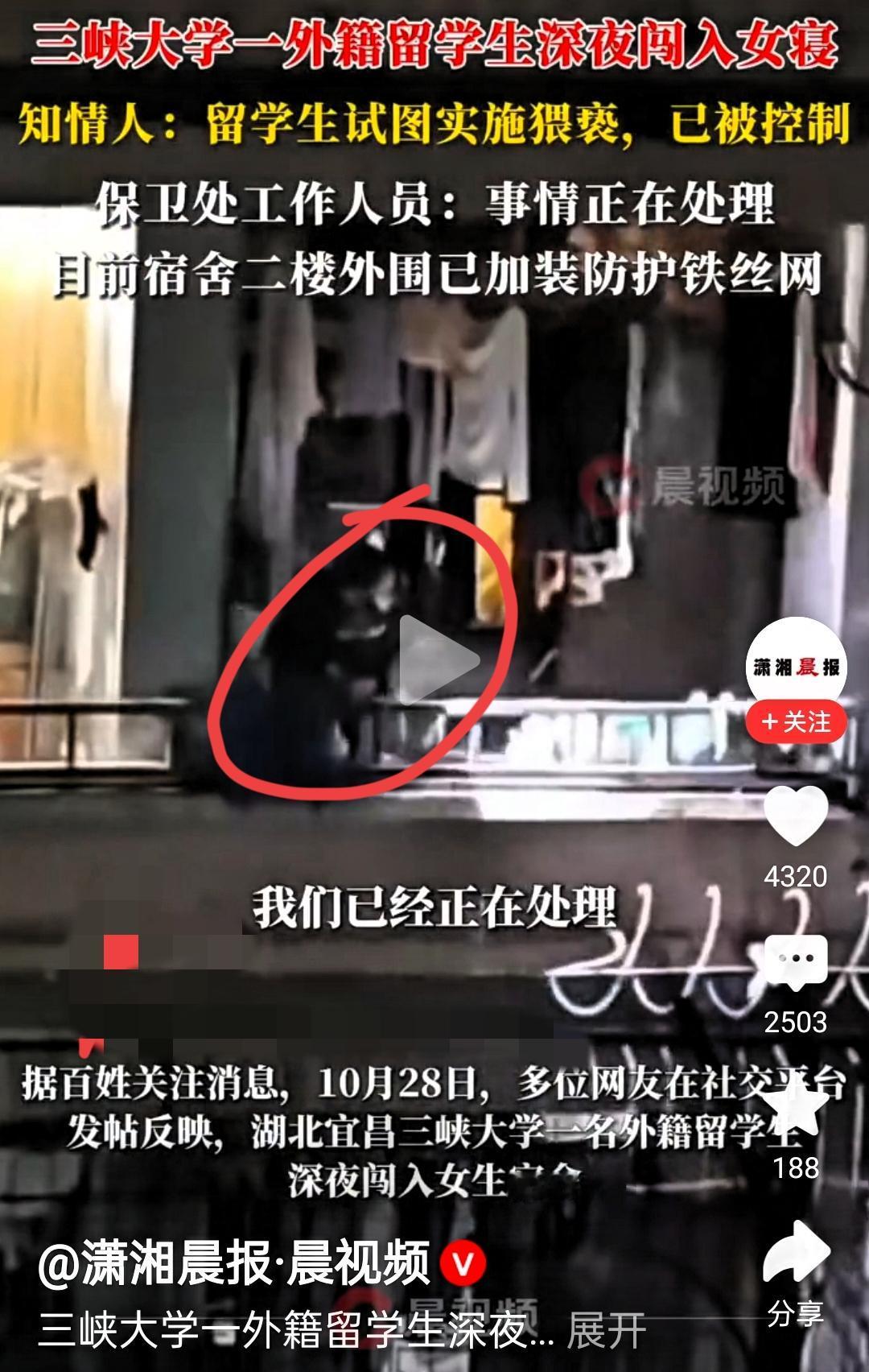 外籍留学生深夜攀爬闯女生宿舍!并且试图猥亵女生!!就这个事,三峡大学开除学籍,已被刑拘 你没发现吗?这留学生明明知道正常进不去女生宿舍,还非要翻墙,说白了就是赌自己“特殊”,觉得顶多被批评两句! 以前总有人觉得外籍学生能搞特殊,可这次三峡大学没惯着,直接开除学籍还刑拘,把“特殊论”撕得明明白白。 早就该这样了!处理坏人是必须的,但校园安全不能只靠“事后算账”。比起开除一个学生,把宿舍安全漏洞堵上,让女生夜里能睡踏实,才是更实在的保护。 你觉得这次处理能彻底打消外籍人员的“特殊侥幸心”吗?