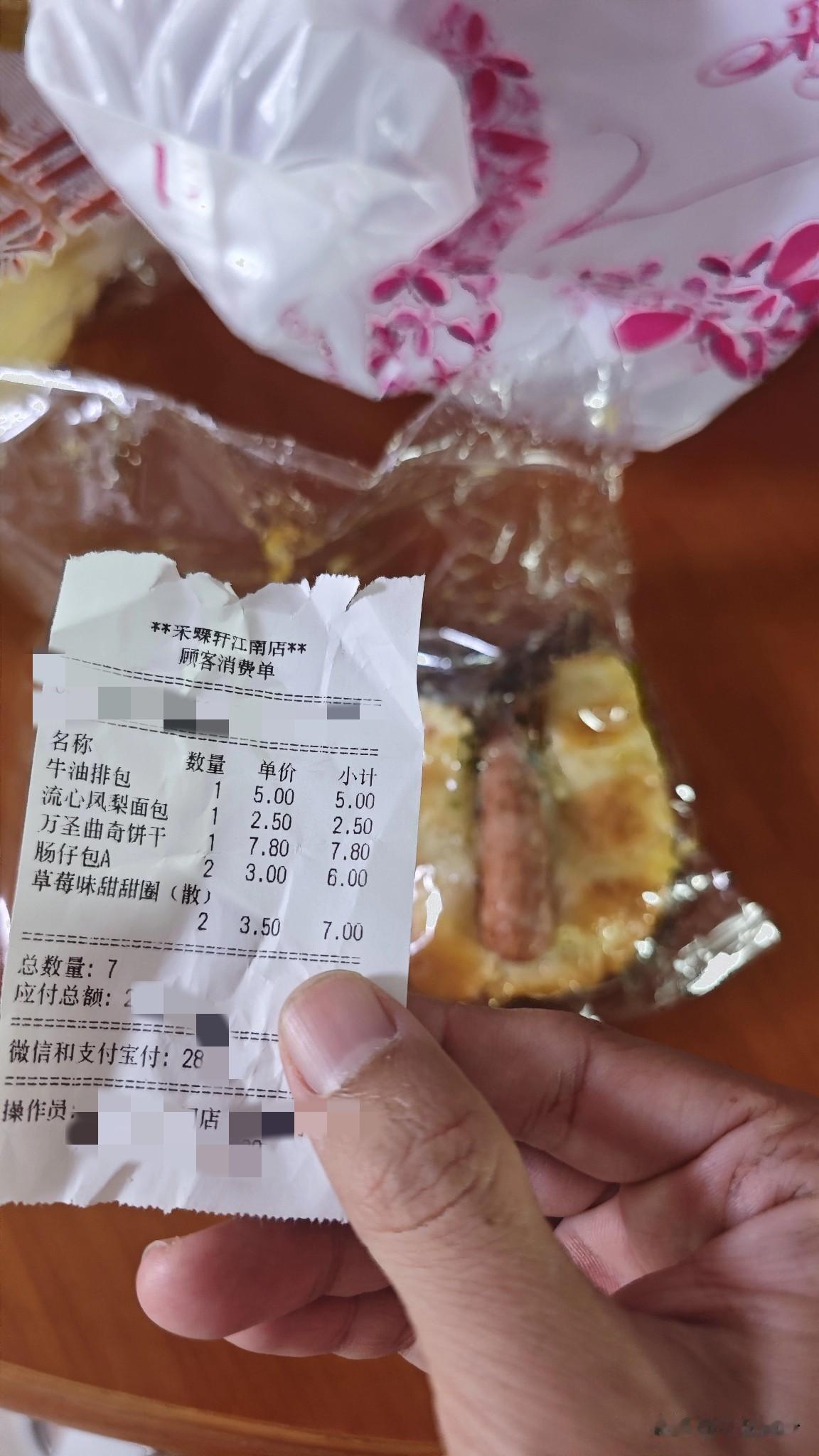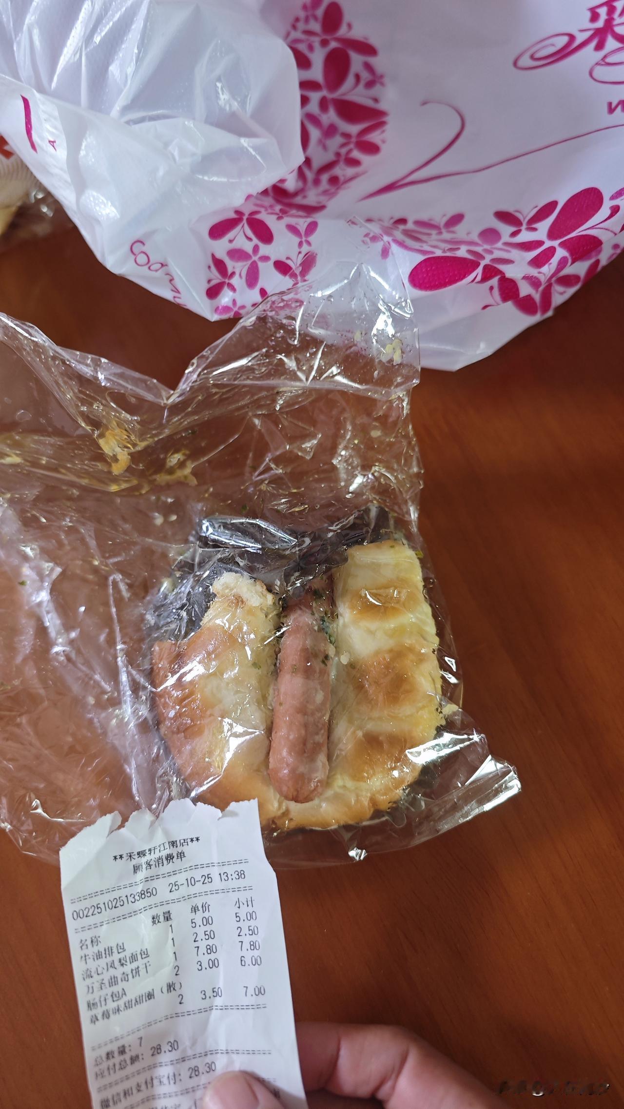 彩蝶轩还是 yyds 啊,这么大的一个肠仔包只要3块钱啊,3块钱啊,味道也很可以啊! 反正在采蝶轩只要避开一些单价刺客,基本上20几块钱可以买一堆面包了。 快点来万达或者蕉门开一家吧!