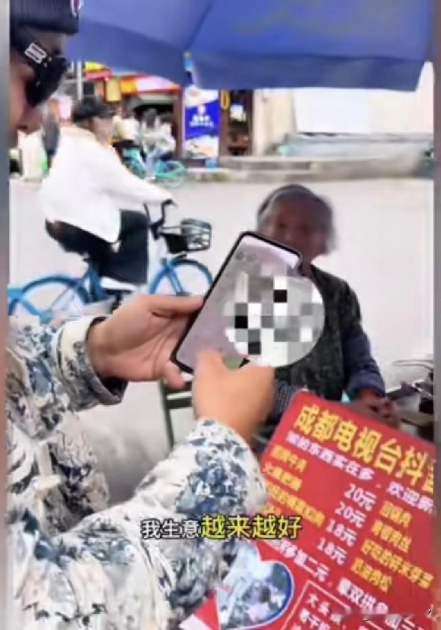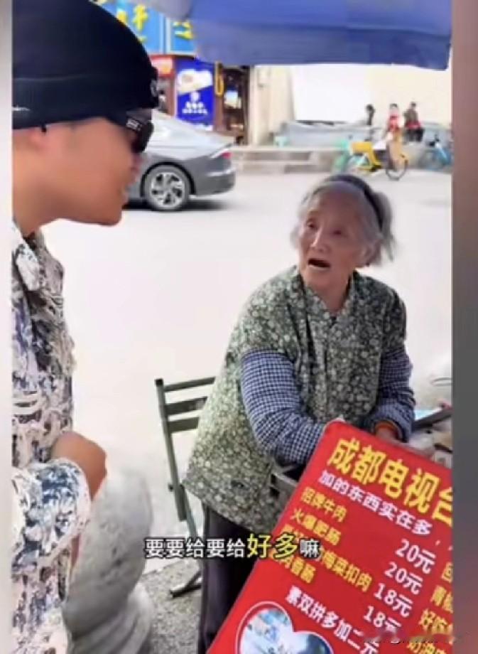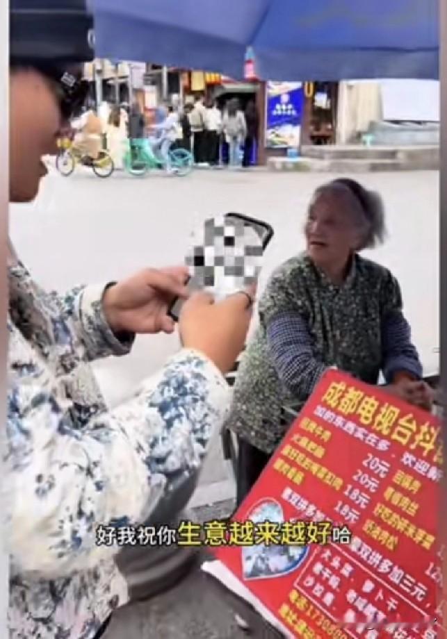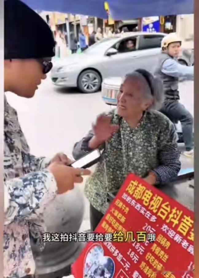 这个蛋烘糕老婆婆 心是真的黑,比煤炭都黑! 昨天还在不停的认错,今天就又开始问博主要钱了,起因是一位唱跳博主,在远处给她拍了一张照,并且给她打印出来送给她,本来想着去换一个蛋烘糕吃,还想听老婆婆夸他一下。 结果老太婆说你把我的视频拍到抖音上去,至少要给500块钱,要不然就不许发,最后小伙一脸懵逼,发了一个红包,老太婆嫌红包太少了,追着这小伙子骂:“规矩都不懂,还耍抖音” 说真的,这老太婆真是不值得同情,虽然都说要尊老爱幼,但是她真的不值得我们尊重,张嘴闭嘴,都是钱,都快钻进钱眼子里了!