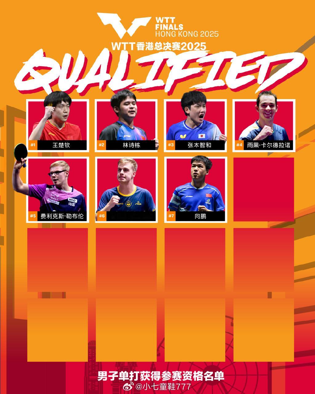 男单:王楚钦、林诗栋、张本智和、雨果、F勒布伦、莫雷加德、向鹏