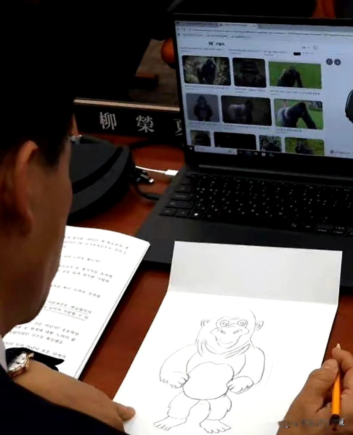 不得不说!柳荣夏这议员当的太有意思了!这么重大的国会监查场合!他居然画起了大猩猩! 被拍到时他正跟着电脑上的图片画,画得还挺像。事后他说平时开会紧张或烦躁时,会画点动物卡通放松,这次大猩猩画大了花了几分钟,还是抽空断断续续画的,不是全程都在画。 虽然被批评“职务怠慢”,但他后来也在脸书道歉了,说确实是失误,反省职责重大。再说他给朴槿惠当律师二十多年,选举、辩护都没落下,平时应该不是偷懒的人。 这哪算不认真?谁工作没个放松摸鱼的时候?关键看平时干没干实事,但是该说不说,画的真挺像的。