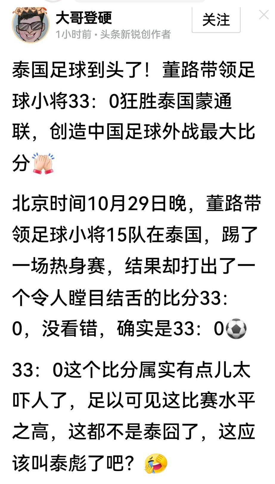 董路的足球小将U15出访泰国,以33:0狂胜蒙通联,创造中国足球史上的奇迹。 平均不到3分钟进一球,对手堂无招架之力,这分明是碾压级。但从另一个角度看,泰国足球近年来大搞归化战略,指不定泰国未来的国足绝大部分都在欧洲踢球哩。 别看足球小将很牛逼,成年后再战就落后人家一个等级,现在泰超已将中超超越。