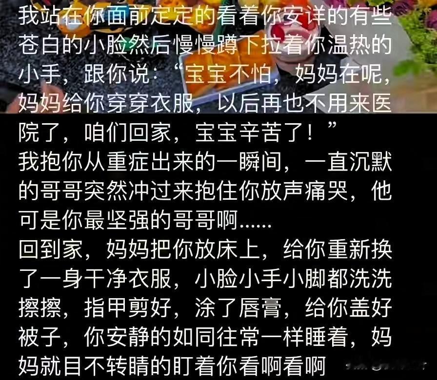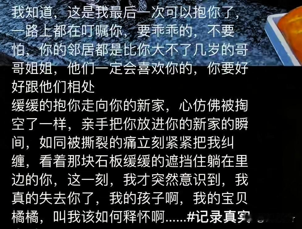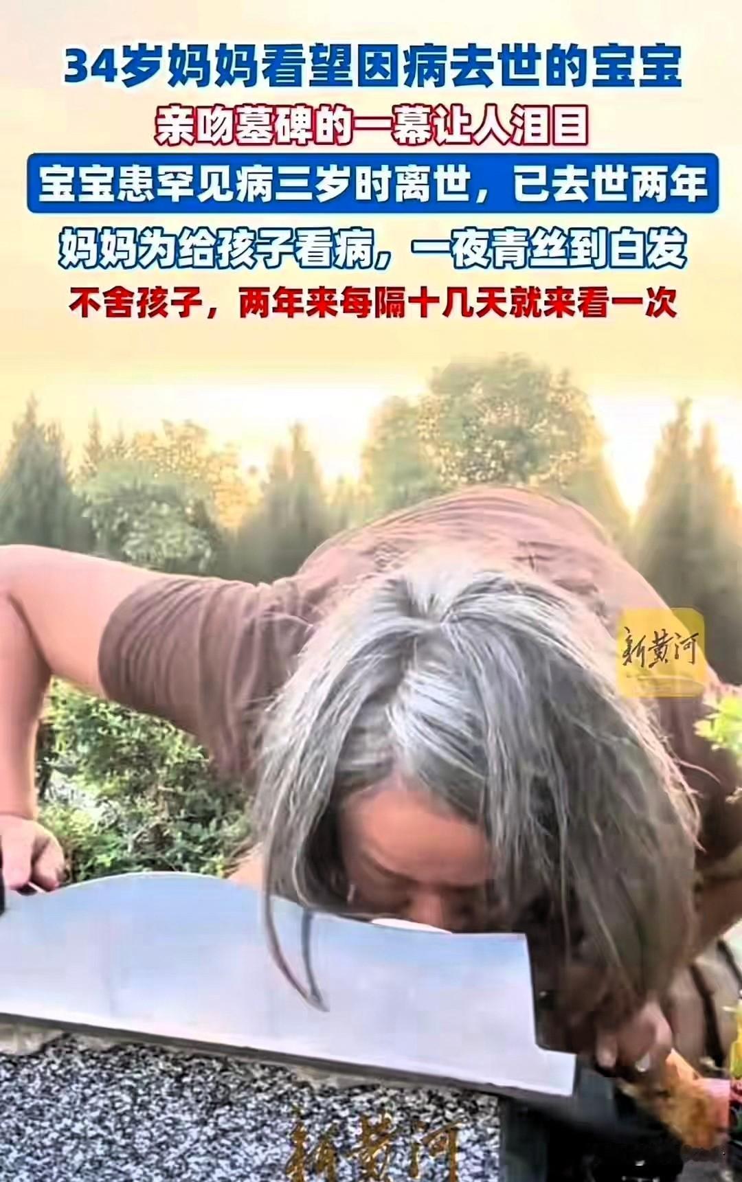 “妈妈在呢!”34岁妈妈满头白发亲吻儿子墓碑坦言:我觉得好累! 谁能想到,本该是穿漂亮裙子、陪娃玩闹的年纪,她却因为三岁的橘橘走了,一头青丝全熬成了白发,每隔十天就雷打不动往墓地跑,带的零食全是孩子没吃过的,蹲在碑前轻声说“从尾巴撕开才甜”,那语气柔得像还在哄睡怀里的娃。 之前为了治橘橘的罕见病,她几乎把医院当家,三天两头跑检查、凑医药费,大儿子才十来岁就学着帮弟弟擦脸、递水杯,一家人熬得眼睛都肿了,可最后还是没留住孩子。 现在她去墓地,会用软布把墓碑擦得锃亮,会跟橘橘“聊”山里的小动物,还会说“有人调皮就告诉妈妈”,有人劝她“别总来,会走不出来”,可谁懂啊?这是她唯一能跟孩子“见面”的地方。 有人说当地有风俗,小娃走了不告诉父母墓地,怕他们陷在悲痛里。可没尝过骨肉分离的人,哪有资格说“放下”?母爱从来不是说断就断的,她现在一遍遍来,不是固执,是想把没陪够的日子,用这种方式慢慢补回来。 好在还有大儿子陪着她,网友也都在留言“好好带老大,替橘橘看遍人间美好”。其实哪有什么“该走出来”的时间表,只要她觉得安心,慢慢来就好。