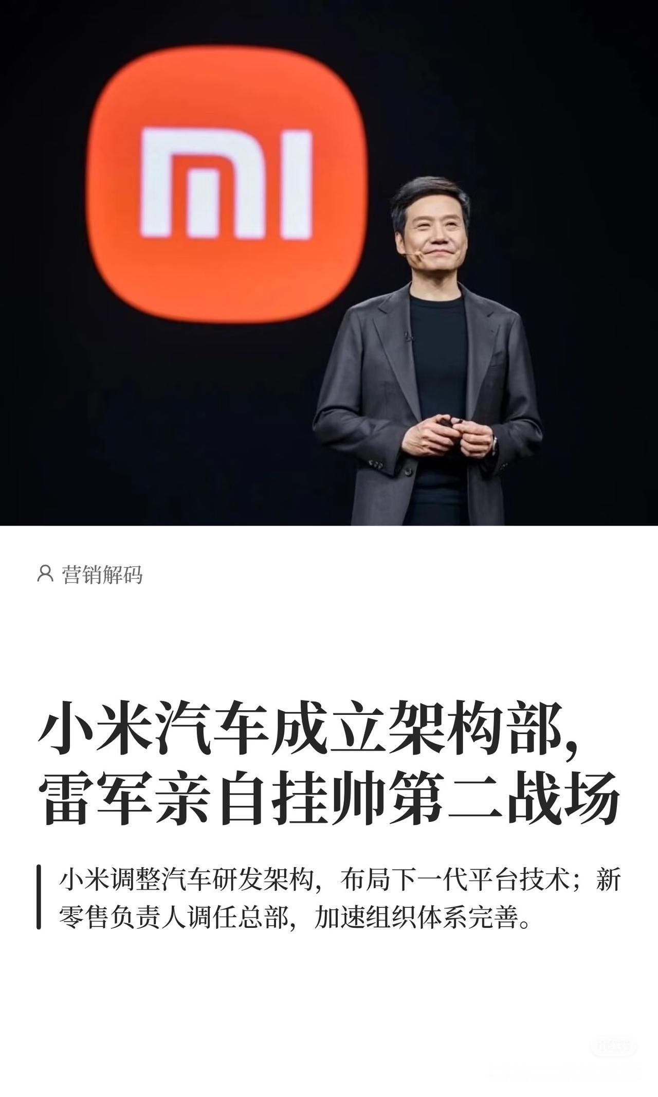 雷军最近在小米汽车的动作有点猛! 新成立的架构部直接向雷军汇报,拉来研发负责人和核心骨干,连整车研发的崔强都调过去,电动力的王振锁接了他的班,明显是要集中火力搞技术。去年搞的智能底盘技术能调140mm举升力四万多牛,现在成立架构部就是要把这些技术再往上推一层,为下一代产品定基调。 这架势铁了心要在智能电动车技术上砸出响,你说这架构部能不能给行业搅出点新花样?