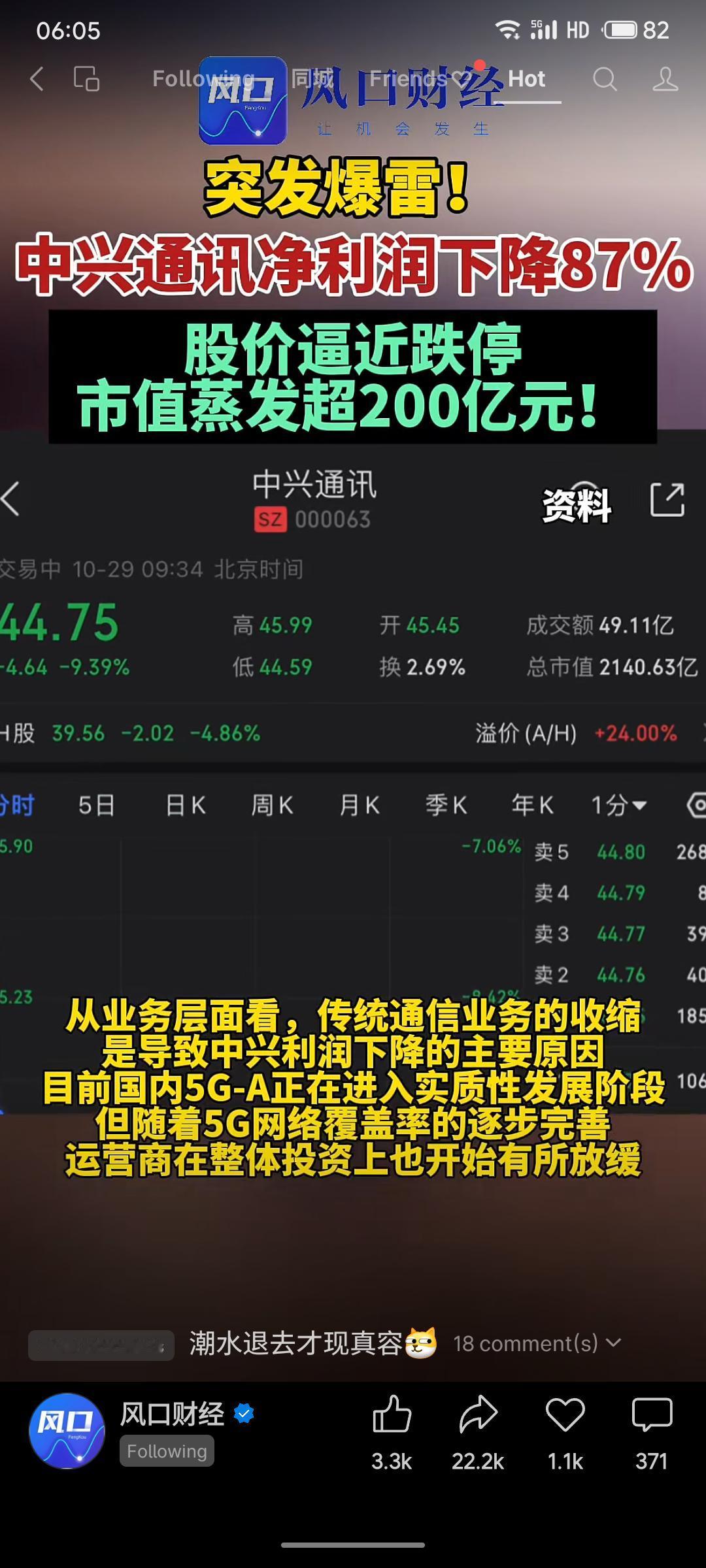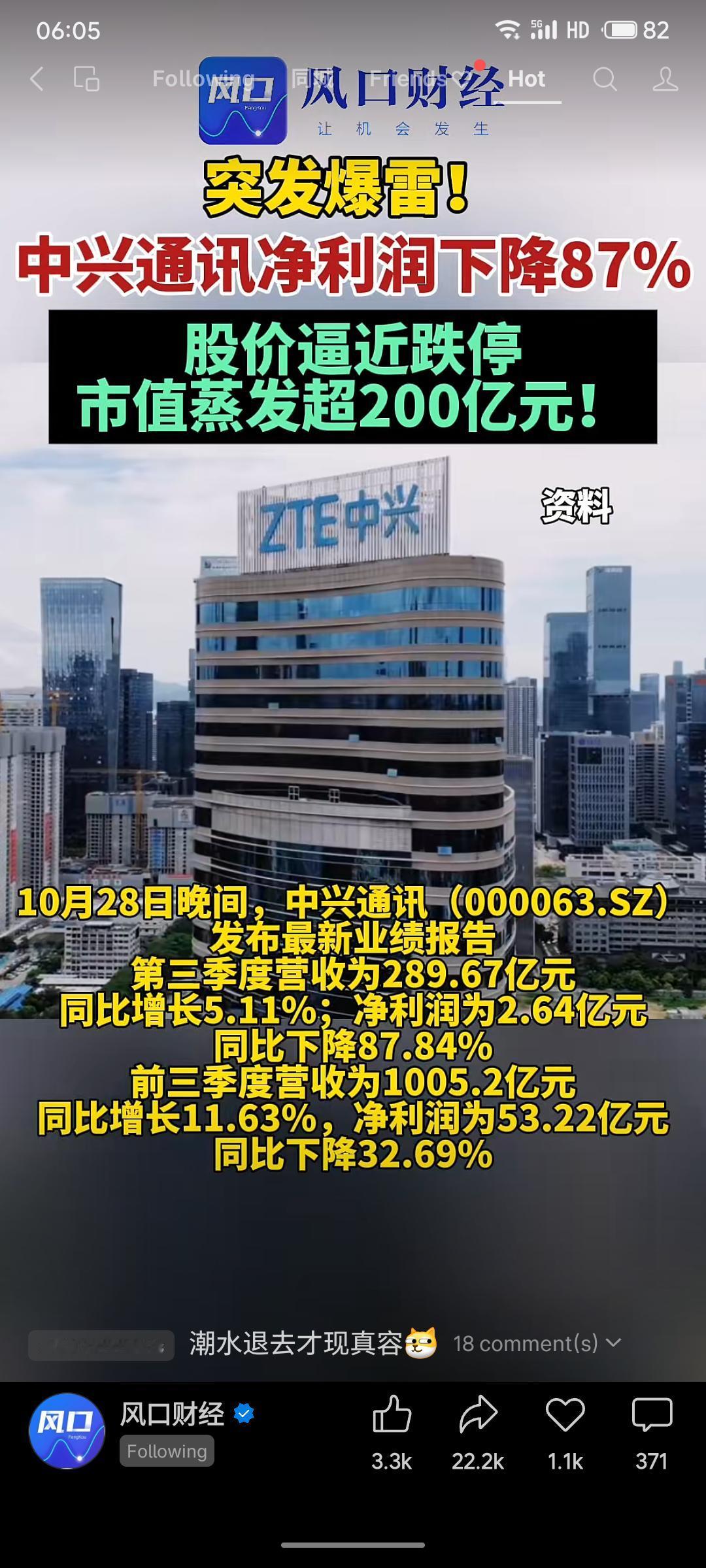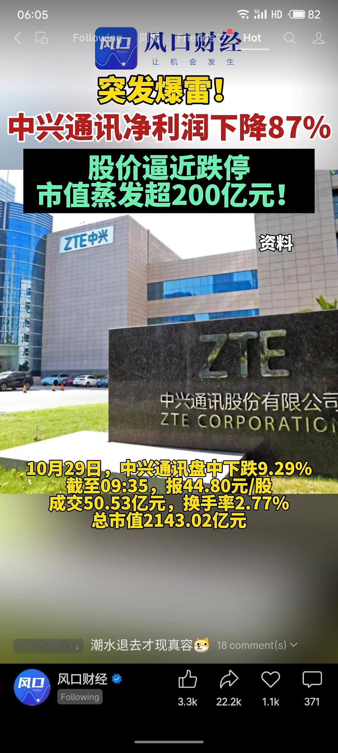 中兴通讯发布最新业绩,第三季度净利润同比骤降87%至2.64亿元,引发股价大幅下跌、单日市值蒸发超200亿元。业绩下滑主要因传统通信业务收缩及国内5G建设投资放缓。此次“爆雷”反映出公司在行业周期变化中所面临的盈利压力。