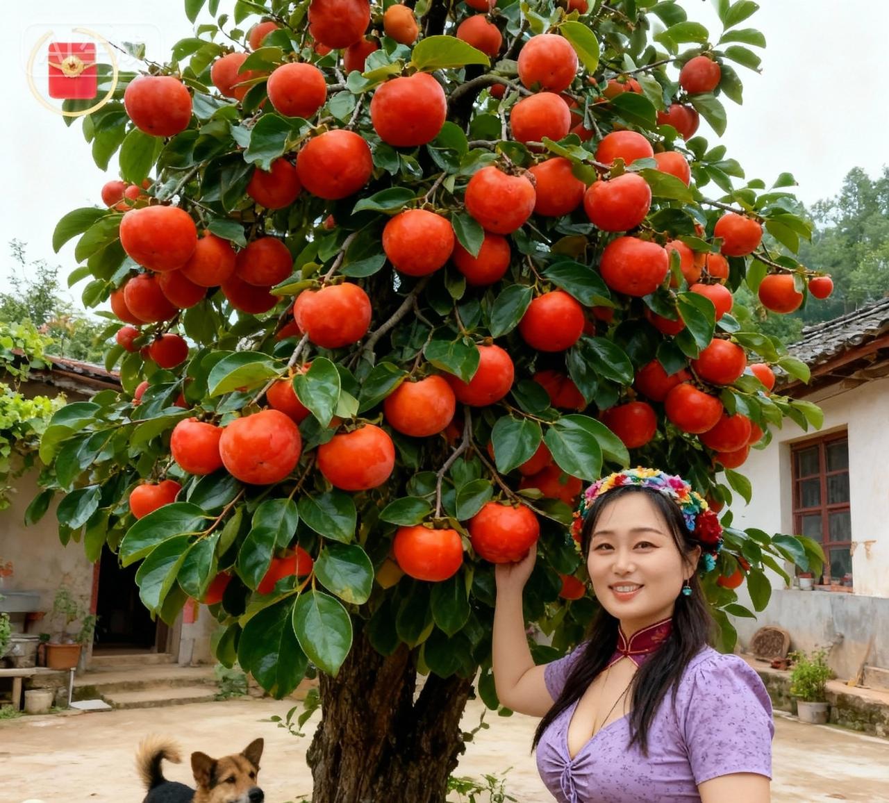 丰收季节,红彤彤的柿子挂满枝头,笑容满面的姑娘与狗狗相伴,享受着大自然的馈赠。
