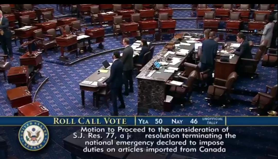 美国参议院以50票赞成、46票反对的结果,投票决定取消由唐纳德·J·特朗普总统对加拿大征收的25%关税。一天前,针对巴西的50%关税刚刚被取消。