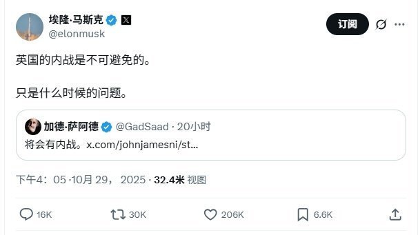 马斯克:英国的内战不可避免的。烽火问鼎计划热点观点