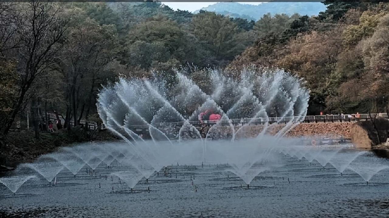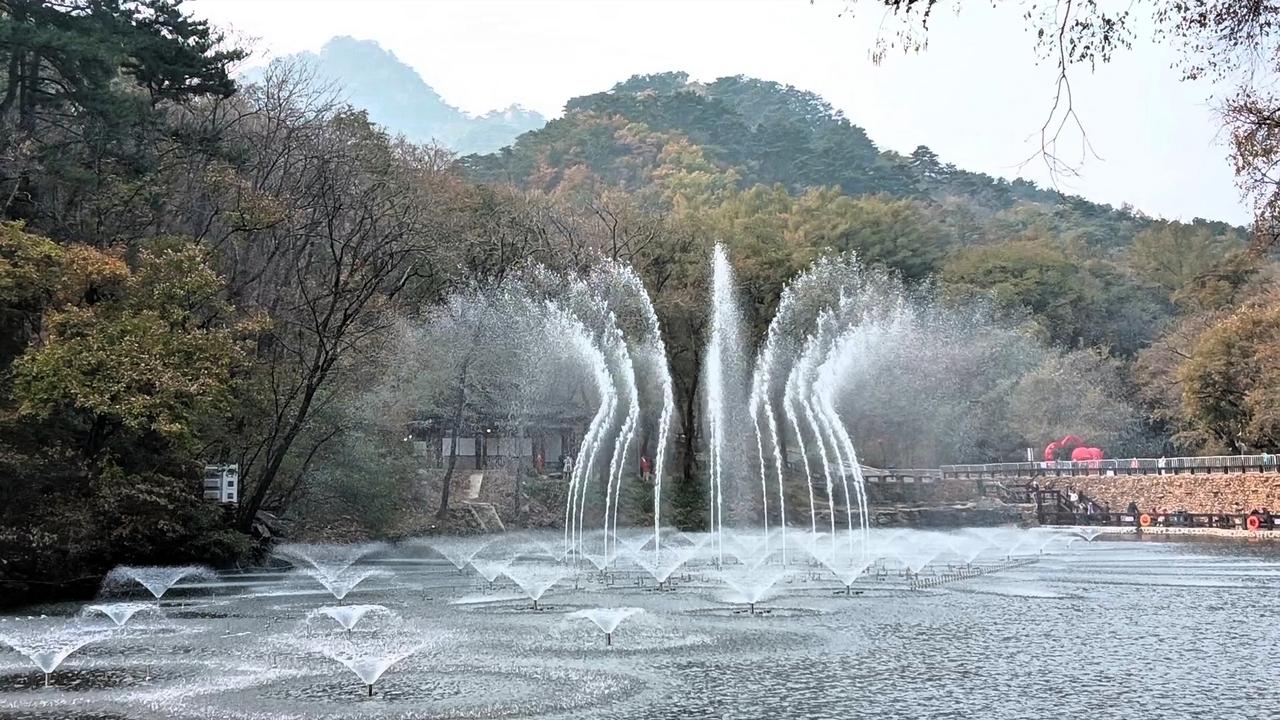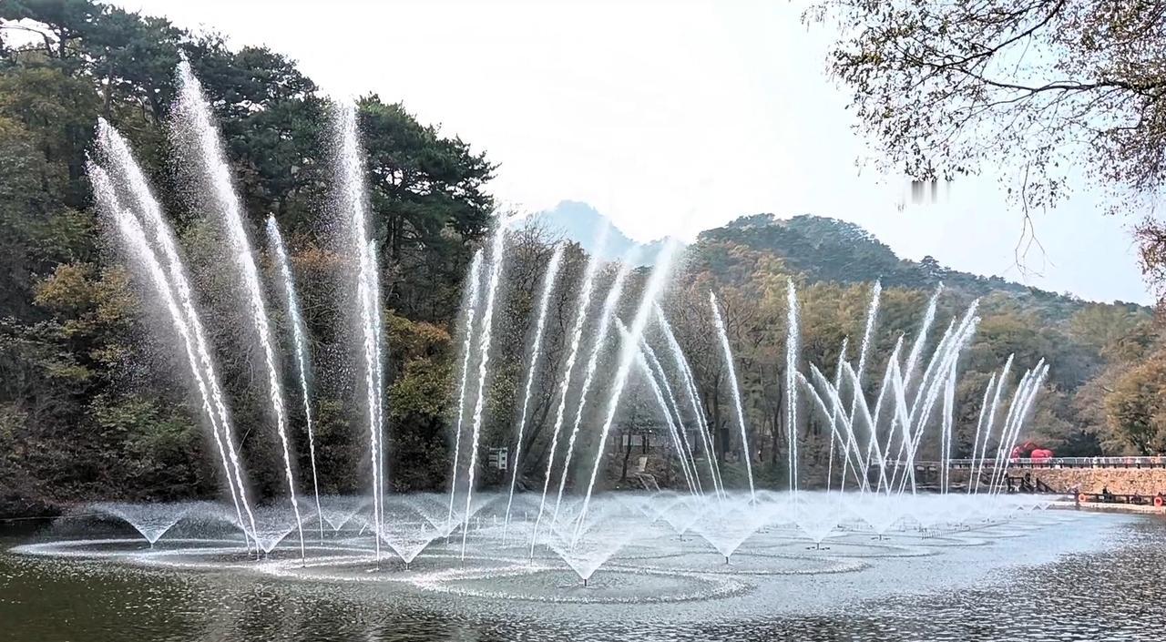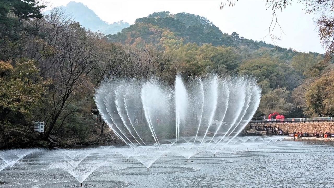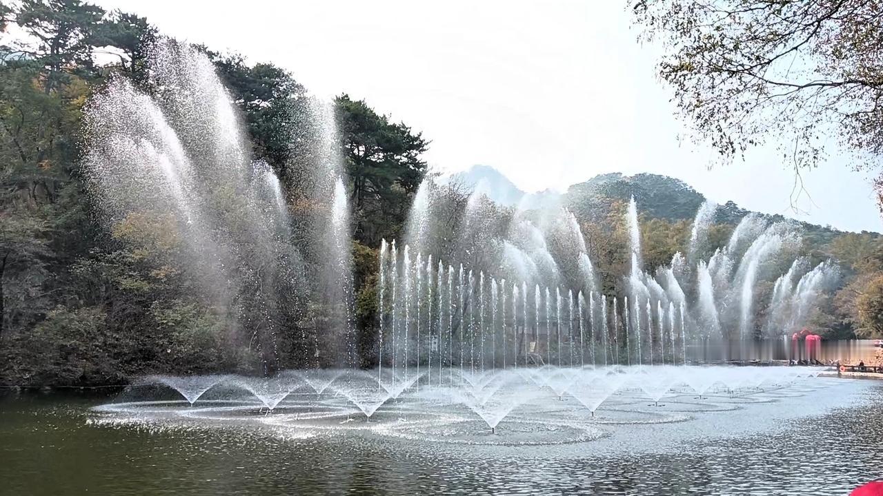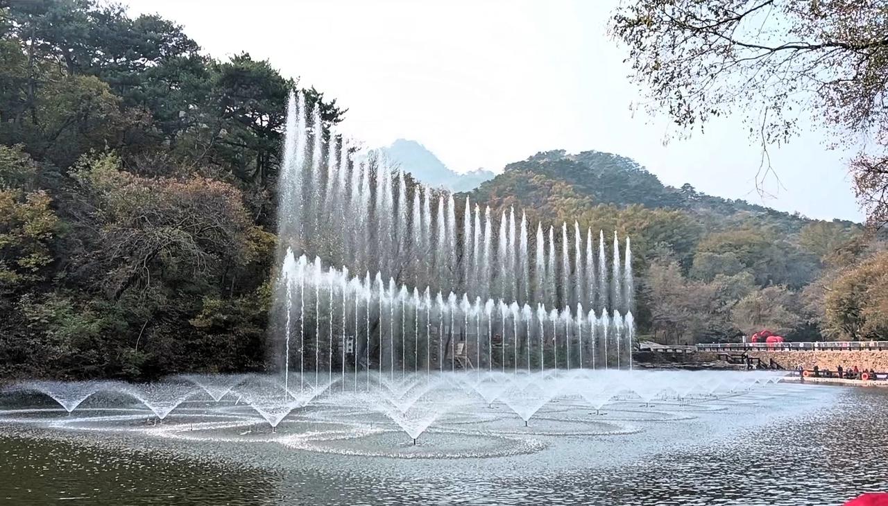 重阳登高千山,本想寻个清静,没成想撞上了最热闹的景致。 刚转过山脚,远远就听见水声轰鸣,走近一看,云潭水面上竟然上演着一场盛大的水之舞蹈。中央几股水柱直冲云霄,像是要把天上的云彩都打湿了;四周的水流则如莲花绽放,在阳光下闪着银光。这哪里是普通喷泉,分明是水中的芭蕾舞团。 栈道上早已站满了人,老的少的都伸着脖子看。旁边一个大爷举着手机拍个不停,嘴里还念叨着:"这喷泉比我家小孙子还精神。"我挤到栏杆边,水雾扑面而来,带着湖水的清凉,瞬间洗去了登山的疲惫。 远处的山峦层叠,秋色正浓。近处的水花飞溅,生机勃勃。这一静一动,一远一近,恰似人生两个境界——既要有登高望远的胸怀,也要有享受当下的闲情。 重阳节的千山,给了我一个意外的惊喜。