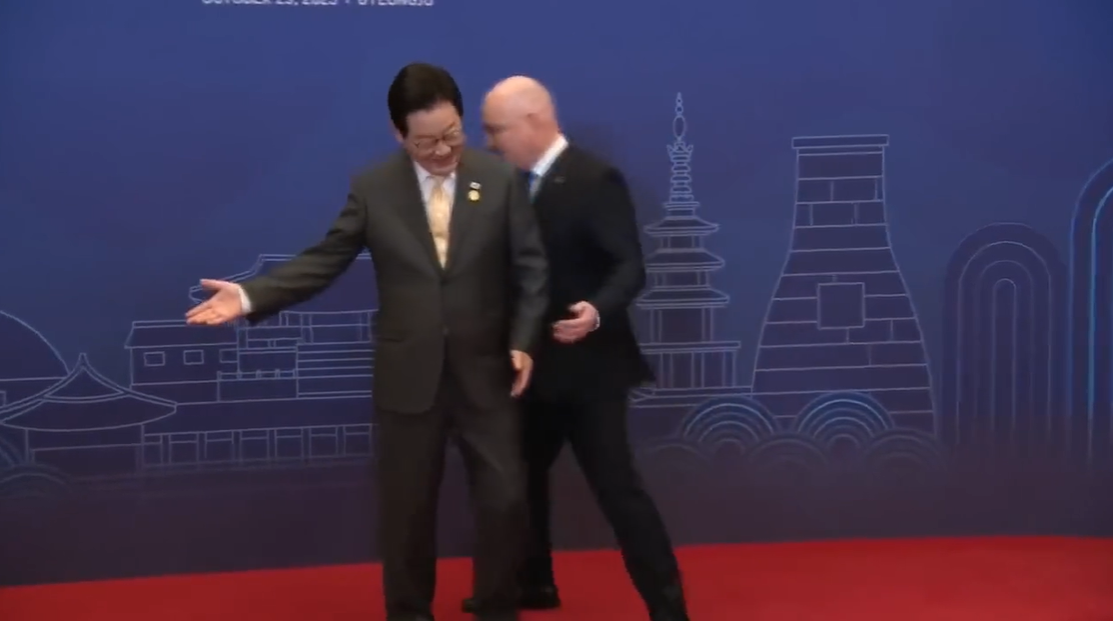 李在明晚宴上接待新西兰总理,被摄影师提醒站错位置!10月29日韩国APEC峰会上,李在明接待到场贵宾,不知道是太紧张了还是只顾聊天了,居然站错位,好在拍照时负责礼仪的工作人员提醒了。 看来公开场合下的礼仪马虎不得,就拿李在明与新西兰总理来说,原本新西兰总理在东道主的引导下去了另一边儿,没想到又被请了回去,俩人在台上握了两次手,美总统都等不及了,新西兰总理为了化解尴尬还与美总统聊天。