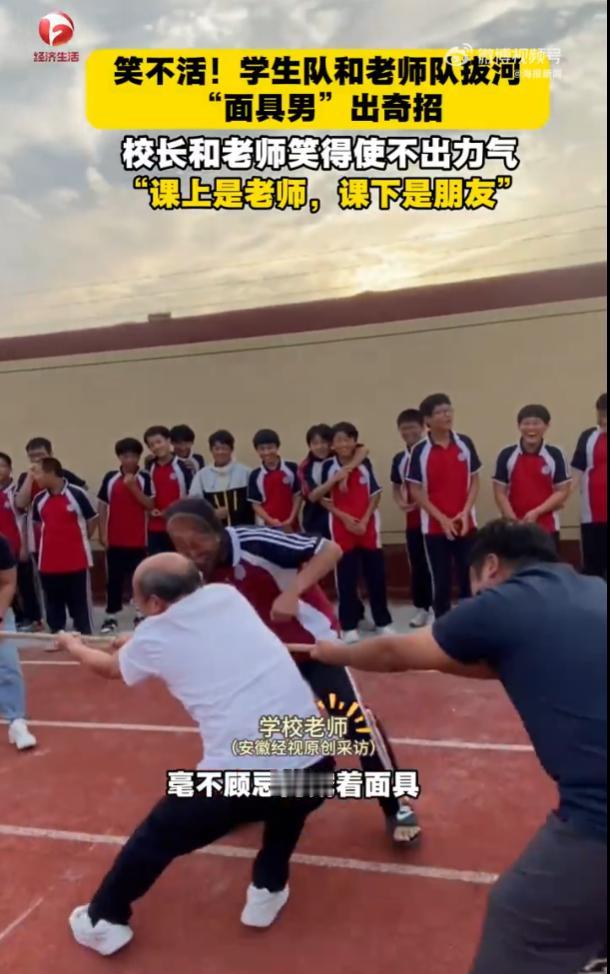 “出奇制胜!”10月29日报道,山东聊城,一所学校举行师生拔河比赛时,一名学生突然戴上夸张面具走到校长面前,该学生对着校长做出搞笑动作,原本用力拔河的校长和老师们顿时笑成一片,网友:有勇有谋。[得意] 这个突发情况让比赛节奏瞬间改变,校长笑得直不起腰,几乎失去拔河的力量,围观师生也被这欢乐场景感染,现场充满笑声,整个过程被在场人员用手机记录下来。 这个创意举动确实活跃了气氛,教师们笑得前仰后合,比赛暂时中断,不过活动很快恢复正常,双方在笑声中完成了比赛,这种即兴互动成为运动会上的亮点时刻。 类似趣事在校园中并不罕见,师生之间的轻松互动都能增进感情,这种突破常规的交流方式,往往比正式活动更能拉近距离。 课堂外的轻松交流对师生关系有积极影响,在紧张学习之余,这类欢乐时刻能有效缓解压力,运动会不仅是竞技平台,更是情感交流的场所。 平等的师生关系有助于营造更好的学习氛围,学生敢于展示幽默的一面,说明校园环境足够包容,校长的开怀大笑也赢得学生好感,教育者展现亲和力的一面,往往能获得更真诚的师生关系,这个小插曲成为运动会上最受欢迎的记忆。 网友们纷纷表示赞赏这种轻松的师生关系,许多人回忆起自己学生时代的类似经历,认为这些时刻特别珍贵。 “有勇有谋,这小孩真是个人才,以后肯定有出息。” “这孩子打的是心理战啊,直接‘擒贼先擒王’,把校长搞笑了,老师队伍军心就散了,这是高手!” “这招得记下来,以后公司拔河比赛说不定能用上。” “这才是青春啊!我们那时候看见校长都绕道走,现在的学生能这样和校长开玩笑,说明关系真的很好。” “只有我关心最后谁赢了吗?” “这还用猜?肯定是学生队赢了啊!校长都笑没劲了,老师们光顾着乐,这还怎么拔?” “我猜是平局!因为两边都笑到没力气了,绳子直接掉地上了。” “求面具链接,想买同款吓唬我家猫。” “希望校长在比赛结束后不要批评这个孩子。” “我猜校长笑着让他写了份800字的《论搞笑面具在拔河比赛中的战术应用》检讨!” “这种欢乐的氛围,比赢得任何比赛都更有价值,它让我们相信,好的教育,就是在这种轻松、尊重的环境里自然发生的。” 假如你是拔河比赛中的一员,你会支持学生队的“奇招致胜”,还是更坚持老师队的“公平竞赛”呢?快来评论区说说你的看法和理由吧! 信源:海报新闻
