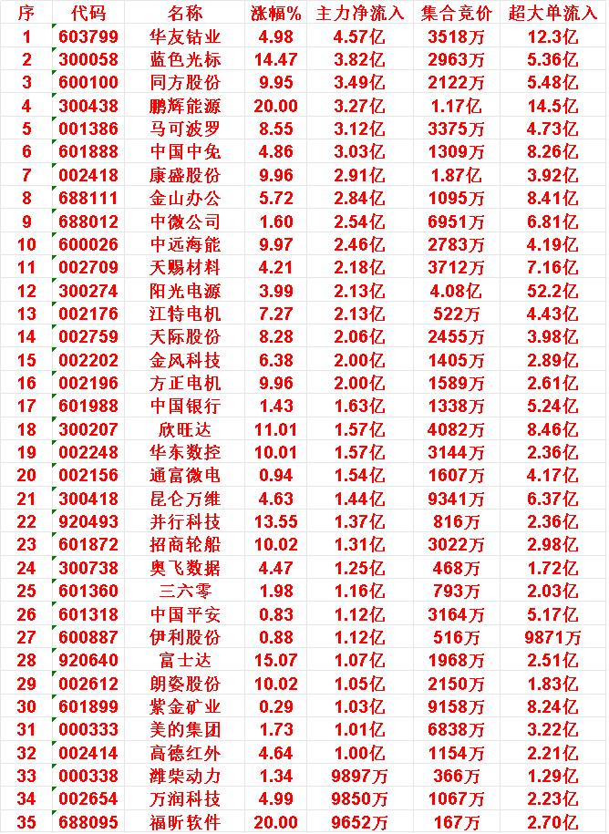 10月30日开盘45分钟,主力资金“买入的 ”的30名单一览! 华友钴业:净流入 4.57亿元 蓝色光标:净流入 3.82亿元 同方股份:净流入 3.49亿元 鹏辉能源:净流入 3.27亿元 马可波罗:净流入 3.12亿元