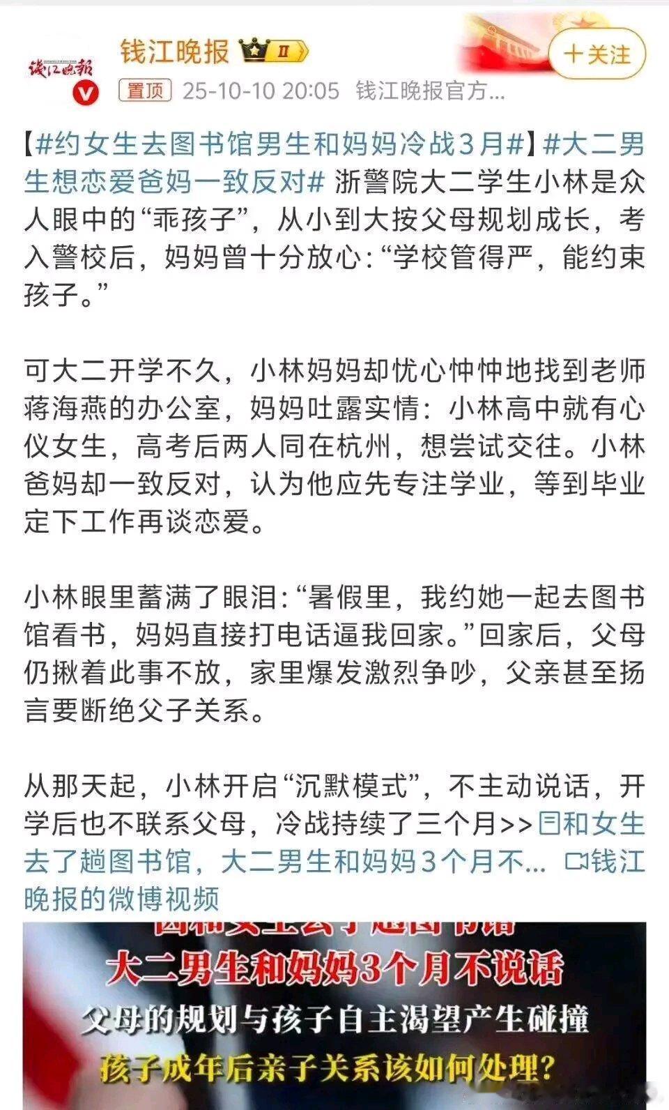 大二男生想恋爱,父母激烈反对,还冷战仨月,这父母简直是“楚门导演式”的存在啊!就说浙江这位小林同学,从小到大按父母规划成长,考入警校本让妈妈放心,可他高中就有心仪女生,高考后想交往,父母却一致反对,觉得该先专注学业。暑假约女友去图书馆,妈妈直接电话逼他回家,还爆发激烈争吵,父亲甚至扬言断绝父子关系。 很多家长把孩子当成“自己人生的延伸”,可孩子是独立个体啊。教育该是启蒙,不是驯服。这父母比《楚门的世界》里的导演还可怕,电影是假的,他们的控制却是真真切切让孩子窒息。