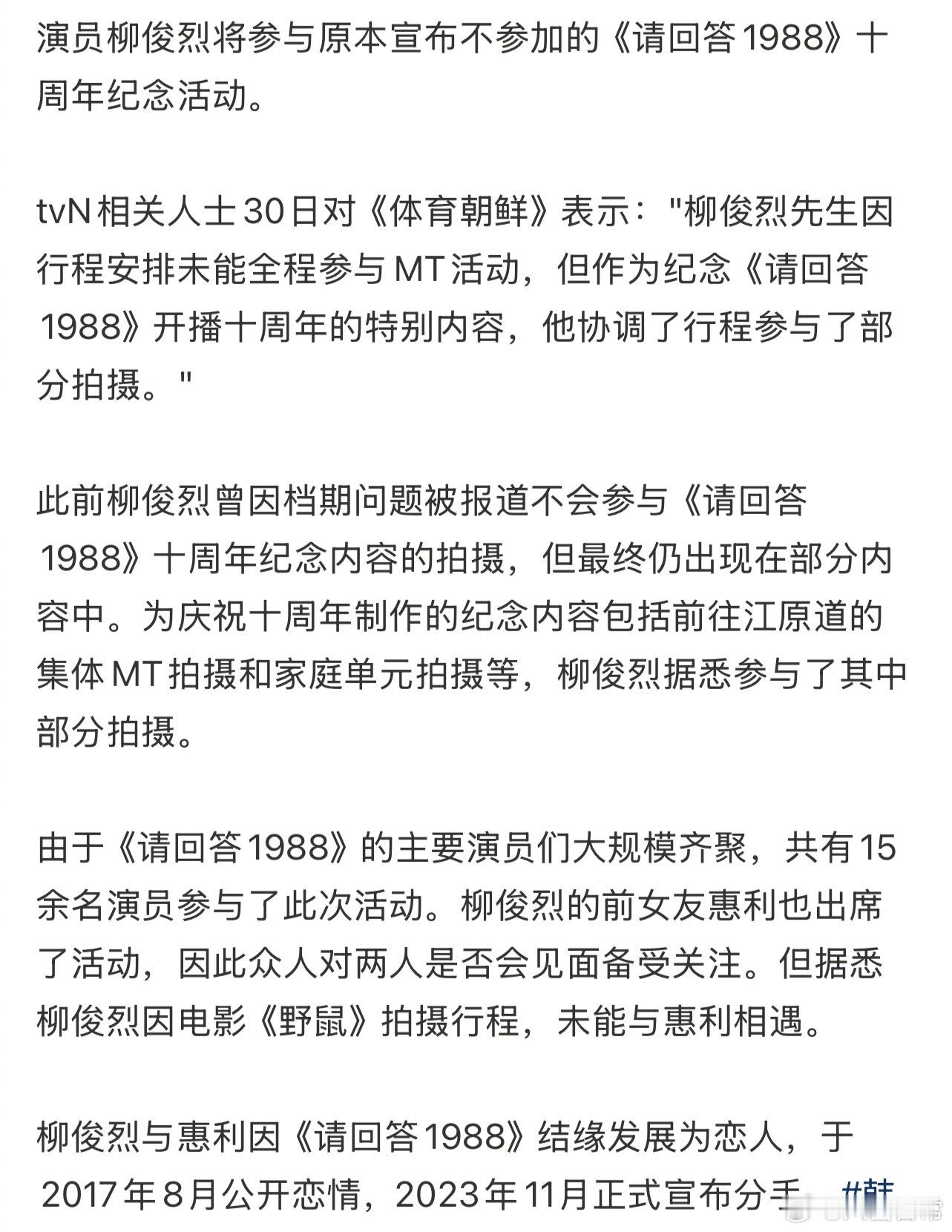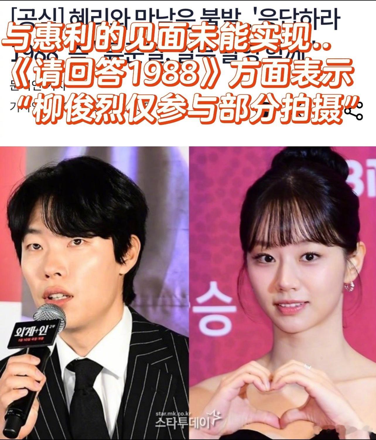 柳俊烈将参加《请回答1988》十周年拍摄。电视台相关人士表示,柳俊烈和李惠利不会见面,柳俊烈只拍摄了开场部分等内容
