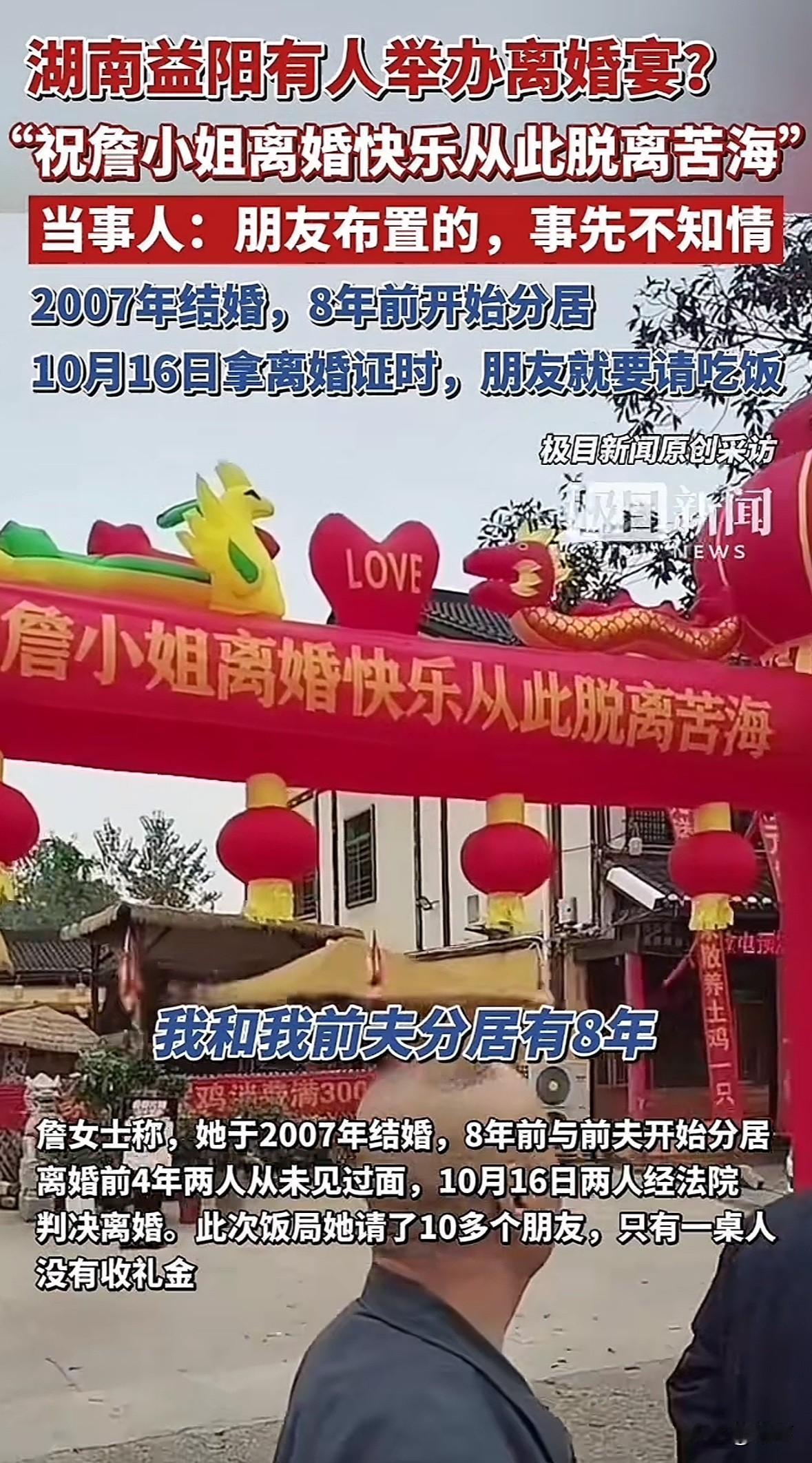 湖南益阳詹女士离婚后被传办“离婚宴”,现场有红色拱门、祝福横幅,其实是朋友私下布置的。她2007年结婚,和前夫分居8年、4年未见,10月16日法院判离,只是像往年请10多个朋友吃顿饭,就一桌人,没收礼金。 有人觉得这是摆脱不幸婚姻的仪式,是个人自由,体现对新生活的期待。但民政局不提倡,说要传递正能量,弘扬正向婚恋观。 确实,离婚不该是耻辱,但大肆庆祝也容易引发争议。像詹女士这样只是朋友小聚还好,要是为博眼球或报复对方办宴,反而伤感情。婚姻是缘分,好聚好散是境界,没必要搞得太张扬,尊重自己也尊重他人更重要。