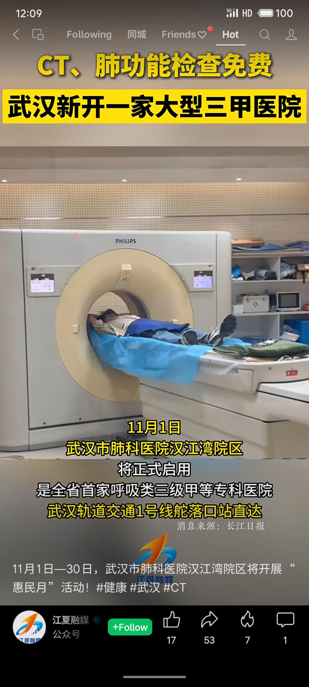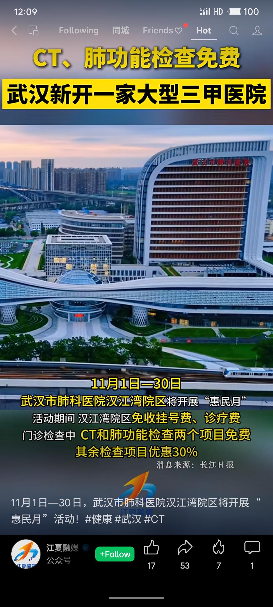 武汉市肺科医院汉江湾院区将于11月1日正式启用,这是湖北省首家呼吸类三级甲等专科医院。为惠民便民,该院区在11月开展“惠民月”活动,期间免收挂号费、诊疗费,CT和肺功能检查免费,其余检查项目享受30%优惠。
