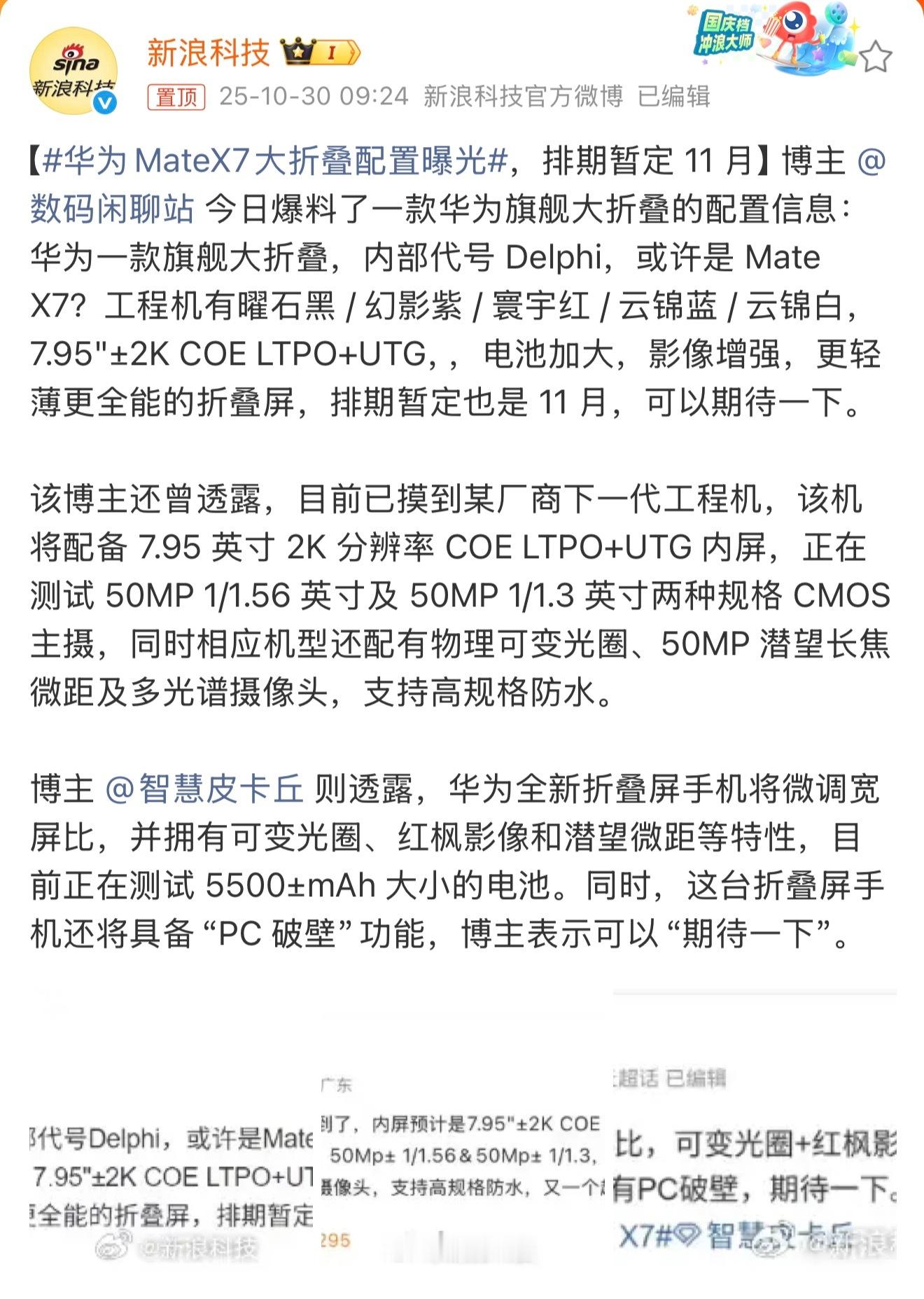 华为MateX7大折叠配置曝光新的Mate X7要来了,看了一下爆料,基本可以说是全面升级了,电池更大了、影像更强了、铰链也有升级,处理器也升级到了麒麟 9030处理器…..