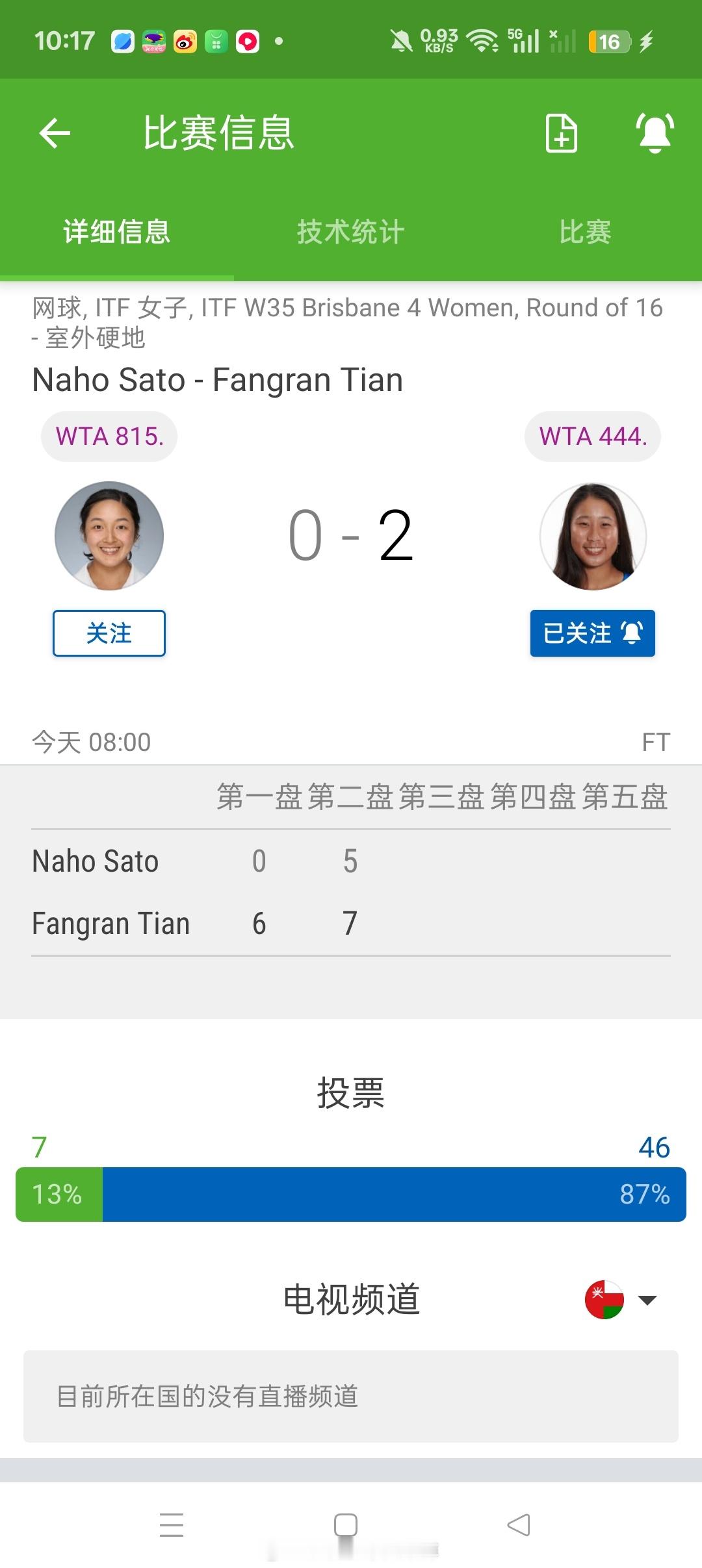 田方然6-07-5击败🇯🇵球员佐藤南繁晋级八强